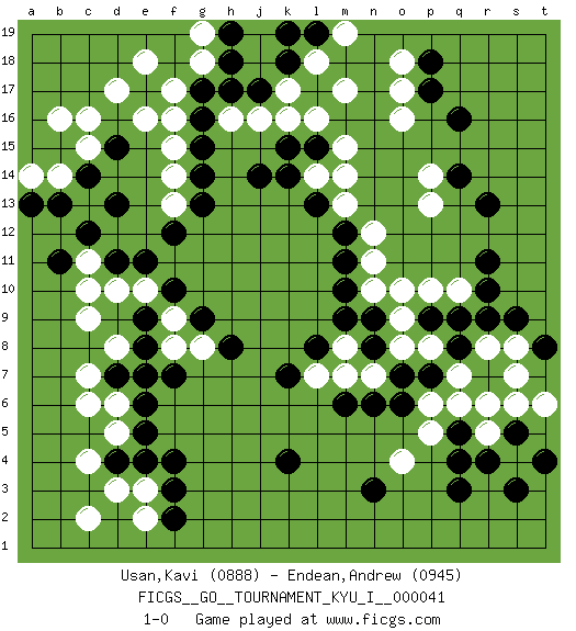 Last move : 1-0 2012 September 14 20:33:43 [Event "FICGS__GO__TOURNAMENT_KYU_I__000041"] [Site "FICGS"] [Date "2012.08.05"] [Round "1"] [Black "Usan,Kavi"] [White "Endean,Andrew"] [Result "1-0"] [Rating 1 "0888"] [Rating 2 "0945"] 1.q16 c4 2.q3 d17 3.r9 c11 4.e4 e3 5.f3 d3 6.f4 c6 7.k4 o17 8.p17 o16 9.r13 k16 10.d15 c15 11.c14 c16 12.d13 b14 13.b13 a14 14.a13 b16 15.c12 c9 16.d11 d10 17.b11 c10 18.d7 c7 19.f7 d8 20.e7 r5 21.q5 q6 22.r4 p5 23.q4 q7 24.q8 p8 25.p9 r8 26.q9 s8 27.p7 o8 28.o7 n7 29.n8 o9 30.n9 o10 31.n6 m7 32.o6 p6 33.m6 m8 34.m9 p10 35.r11 q10 36.r10 n11 37.l8 s4 38.s5 r6 39.s3 s6 40.t4 t6 41.s9 s7 42.t8 o4 43.n3 l7 44.k7 p14 45.q14 p13 46.m11 n12 47.m12 m13 48.g16 f17 49.g17 f16 50.g15 f15 51.g14 f14 52.k14 m15 53.l15 l16 54.l13 m14 55.f12 e16 56.e11 e10 57.f10 f9 58.g9 n10 59.m10 l14 60.k15 g18 61.h18 g19 62.h19 e18 63.j17 j16 64.j14 k17 65.k18 l18 66.l19 m19 67.k19 m17 68.p18 o18 69.f2 e2 70.d4 c2 71.e9 f8 72.e8 g8 73.h8 h16 74.h17 f13 75.g13 d5 76.e5 d6 77.e6 1-0 Here are the names of the openings (joseki) played in the four corners : Corner d4 : c4 e4 Komoku (Somok, Xiao~mu`) 3-4 Point. The komoku (3-4) point is the traditional corner enclosure move.. Ikken Takagakari (Hankan Nop'dakeolch'im, Yi Gaogua`jiao~, 1-Space High Approach). The 5-4 approach move has become more popular in modern times, as modern Go emphasizes speed and influence. Corner q16 : q16 o17 Hoshi (Hwajeom, Seongjeom, Xingwei`) 4-4 Point. The star or hoshi (4-4) point, emphasizing influence at the potential expense of territory. Ikken Kakari (Hankan Keolch'im, Yi Gua`jiao~, 1-Space Low Approach). White 2 is the standard approach move to the 4-4. Player Black won this Go (weiqi, baduk) game. Follow this game move after move (download)Go is essentially a form of harmony. Go in the 21st century will have to be go of the 'harmony of the six points - the four quarters, the above and the below.' As in life we will need to view the whole rather than the part. Japanese go has focused too heavily on the local (joseki) rather than the whole for 300 years. The reason the Chinese and Koreans are overtaking the Japanese is that they are closer to achieve this whole-board view. (Go Seigen, 9p, 1994) There's no money in correspondence chess. (John Knudsen)