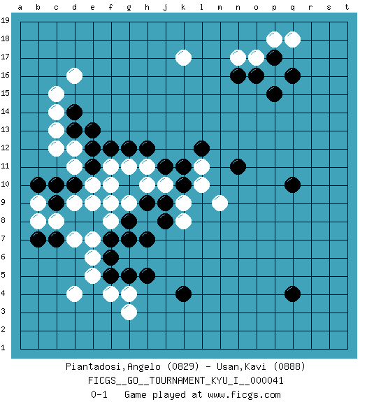 Last move : 0-1 2012 October 28 9:45:56 [Event "FICGS__GO__TOURNAMENT_KYU_I__000041"] [Site "FICGS"] [Date "2012.08.05"] [Round "1"] [Black "Piantadosi,Angelo"] [White "Usan,Kavi"] [Result "0-1"] [Rating 1 "0829"] [Rating 2 "0888"] 1.q16 d4 2.q4 d16 3.q10 k17 4.k4 o17 5.p15 q18 6.p17 p18 7.o16 n17 8.n16 g3 9.g5 g4 10.h5 e7 11.f7 e6 12.f6 e5 13.f5 f4 14.e8 f8 15.g8 f9 16.d10 e9 17.d8 d9 18.c9 c8 19.c7 b8 20.b7 b9 21.c10 d7 22.b10 c13 23.e13 c15 24.d14 c14 25.e11 e10 26.g10 g9 27.h9 h8 28.g7 h10 29.j9 j10 30.k10 k9 31.j8 k8 32.h7 l10 33.k11 g11 34.j11 h11 35.f12 f11 36.h12 d11 37.e12 d12 38.d13 c12 39.g12 f10 40.n11 l11 41.l12 m9 0-1 This go game has been lost on time (started : 2012.08.05 14:34:5) Here are the names of the openings (joseki) played in the four corners : Corner q16 : q16 o17 Hoshi (Hwajeom, Seongjeom, Xingwei`) 4-4 Point. The star or hoshi (4-4) point, emphasizing influence at the potential expense of territory. Ikken Kakari (Hankan Keolch'im, Yi Gua`jiao~, 1-Space Low Approach). White 2 is the standard approach move to the 4-4. Corner q4 : q4 m9 Hoshi (Hwajeom, Seongjeom, Xingwei`) 4-4 Point. The star or hoshi (4-4) point, emphasizing influence at the potential expense of territory. Player White won this Go (weiqi, baduk) game. Follow this game move after move (download)I really believe that Go is destined to take the place of Chess as the leading intellectual game of the Occident, just as it has reigned supreme in the Orient for some four thousand years. (Edward Lasker, international chess master) I can't decide which is riskier; taking crazy risks, or taking advice on crazy risks from a crazy risk taker. (Gregory House in House M.D.)