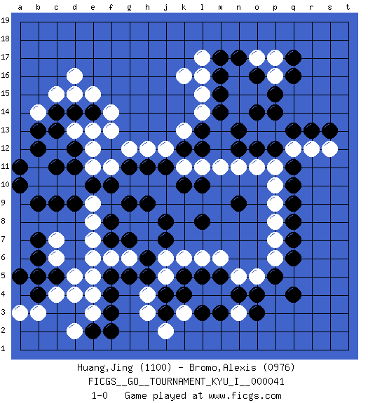 Last move : 1-0 2012 October 20 8:38:51 [Event "FICGS__GO__TOURNAMENT_KYU_I__000041"] [Site "FICGS"] [Date "2012.08.05"] [Round "1"] [Black "Huang,Jing"] [White "Bromo,Alexis"] [Result "1-0"] [Rating 1 "1100"] [Rating 2 "0976"] 1.q16 d4 2.q4 d16 3.f3 e3 4.f4 e4 5.f5 e5 6.k4 k16 7.c14 c15 8.d14 d15 9.e14 e15 10.c9 d10 11.d9 e9 12.e10 e11 13.f10 f11 14.d11 c10 15.c11 b10 16.b9 b11 17.b12 c12 18.d12 d13 19.c13 e13 20.a10 e12 21.a11 f14 22.g11 f13 23.m17 l17 24.m16 l16 25.m15 l15 26.q10 p11 27.q11 q12 28.p12 p13 29.o12 o11 30.q13 r12 31.r13 o13 32.n12 s12 33.s13 n11 34.n13 n14 35.m14 n15 36.o16 o15 37.p14 n16 38.n17 p16 39.p15 o17 40.o14 p17 41.o16 g12 42.h11 h12 43.j11 j12 44.k12 k13 45.l13 l14 46.l12 k11 47.k10 l11 48.l10 m11 49.n9 p10 50.q9 p9 51.q8 p8 52.q7 p7 53.q6 p6 54.p5 o5 55.o4 n5 56.n4 m4 57.m5 m6 58.l5 l6 59.l8 l4 60.k5 k6 61.j8 j6 62.h5 j5 63.j4 b14 64.b13 k3 65.j3 n3 66.o3 j2 67.l3 h3 68.m3 h4 69.h6 h7 70.f7 g6 71.g5 f6 72.g7 e6 73.j7 h8 74.h9 g8 75.f8 e7 76.g9 e8 77.c5 b5 78.b6 c7 79.b7 c6 80.b4 c4 81.a5 b3 82.e2 d2 83.f2 d5 84.b5 a3 85.q17 1-0 Here are the names of the openings (joseki) played in the four corners : Corner d4 : d4 f3 Hoshi (Hwajeom, Seongjeom, Xingwei`) 4-4 Point. The star or hoshi (4-4) point, emphasizing influence at the potential expense of territory. Ikken Kakari (Hankan Keolch'im, Yi Gua`jiao~, 1-Space Low Approach). Black 2 is the standard approach move to the 4-4. Corner d16 : d16 c14 Hoshi (Hwajeom, Seongjeom, Xingwei`) 4-4 Point. The star or hoshi (4-4) point, emphasizing influence at the potential expense of territory. Ikken Kakari (Hankan Keolch'im, Yi Gua`jiao~, 1-Space Low Approach). Black 2 is the standard approach move to the 4-4. Player Black won this Go (weiqi, baduk) game. Follow this game move after move (download)Every move brings change. (Pierre Audouard) Knowledge will give you power, but character respect. (Bruce Lee)