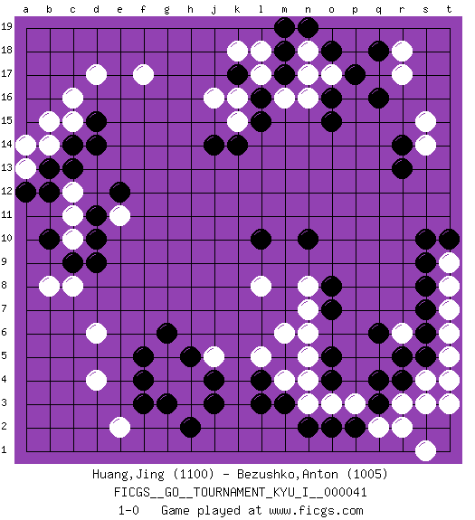 Last move : 1-0 2013 January 25 0:44:7 [Event "FICGS__GO__TOURNAMENT_KYU_I__000041"] [Site "FICGS"] [Date "2012.08.05"] [Round "1"] [Black "Huang,Jing"] [White "Bezushko,Anton"] [Result "1-0"] [Rating 1 "1100"] [Rating 2 "1005"] 1.q16 d4 2.q4 d17 3.d15 c15 4.c14 c16 5.d14 f17 6.d10 c8 7.b10 c12 8.e12 c10 9.c9 c11 10.d9 e11 11.d11 b14 12.b13 b15 13.c13 a13 14.a12 a14 15.b12 b8 16.f3 h3 17.f5 d6 18.j4 h4 19.j3 o3 20.m3 r6 21.o4 r3 22.q3 q2 23.p2 r2 24.r4 s4 25.s5 s3 26.r5 p3 27.o2 n3 28.n2 n4 29.o5 m4 30.l4 l5 31.l3 m6 32.q6 t5 33.t4 t3 34.s6 t6 35.s7 t7 36.s9 t9 37.t10 t8 38.s8 t4 39.s10 s1 40.h5 g4 41.f4 g5 42.g6 e2 43.h2 o17 44.o16 n16 45.o15 r17 46.p17 n17 47.q18 s15 48.r14 s14 49.r13 r18 50.l16 l17 51.k17 k16 52.l15 j16 53.m17 l18 54.m18 k18 55.o18 n18 56.n19 l8 57.l10 n8 58.n10 j5 59.g3 n5 60.o7 n6 61.o8 n7 62.j14 k15 63.k14 m16 64.m19 1-0 This go game has been lost on time (started : 2012.08.05 14:34:5) Here are the names of the openings (joseki) played in the four corners : Corner d16 : d17 d15 Komoku (Somok, Xiao~mu`) 3-4 Point. The komoku (3-4) point is the traditional corner enclosure move.. Ikken Takagakari (Hankan Nop'dakeolch'im, Yi Gaogua`jiao~, 1-Space High Approach). The 5-4 approach move has become more popular in modern times, as modern Go emphasizes speed and influence. Corner q4 : q4 o3 Hoshi (Hwajeom, Seongjeom, Xingwei`) 4-4 Point. The star or hoshi (4-4) point, emphasizing influence at the potential expense of territory. Ikken Kakari (Hankan Keolch'im, Yi Gua`jiao~, 1-Space Low Approach). White 2 is the standard approach move to the 4-4. Corner q16 : q16 o17 Hoshi (Hwajeom, Seongjeom, Xingwei`) 4-4 Point. The star or hoshi (4-4) point, emphasizing influence at the potential expense of territory. Ikken Kakari (Hankan Keolch'im, Yi Gua`jiao~, 1-Space Low Approach). White 2 is the standard approach move to the 4-4. Player Black won this Go (weiqi, baduk) game. Follow this game move after move (download)Be a little patient. Keshi works ! (Anonymous) Inventor: A person who makes an ingenious arrangement of wheels, levers and springs, and believes it civilization. (Ambrose Bierce, The Devil's Dictionary)