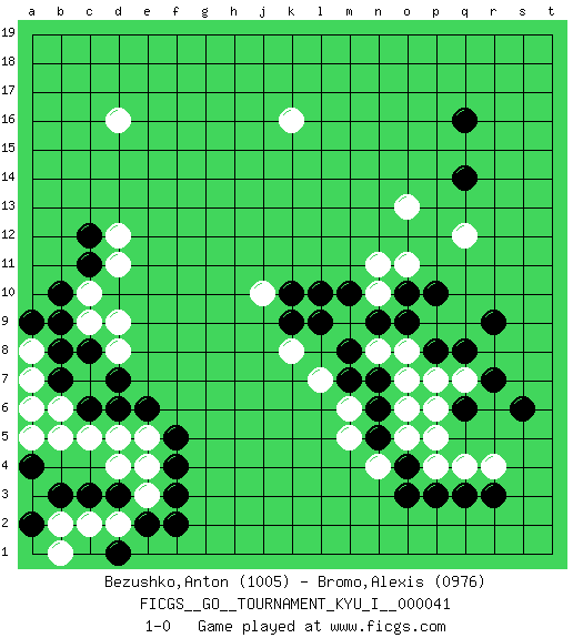 Last move : 1-0 2012 August 10 21:54:57 [Event "FICGS__GO__TOURNAMENT_KYU_I__000041"] [Site "FICGS"] [Date "2012.08.05"] [Round "1"] [Black "Bezushko,Anton"] [White "Bromo,Alexis"] [Result "1-0"] [Rating 1 "1005"] [Rating 2 "0976"] 1.q16 d4 2.q3 d16 3.f3 e3 4.f4 e4 5.f5 e5 6.c6 c5 7.e6 d5 8.d6 b6 9.b7 b5 10.e2 d2 11.f2 k16 12.c3 c7 13.c8 a7 14.b8 a8 15.a6 a5 16.a9 a6 17.b10 d8 18.d7 d9 19.d3 c2 20.b3 b2 21.a2 b1 22.d1 a3 23.a4 c9 24.b9 c10 25.c11 d11 26.c12 d12 27.r9 o13 28.q14 q12 29.p10 o11 30.o10 n10 31.n9 m9 32.m10 n11 33.l10 n8 34.o9 o8 35.k10 j10 36.k9 k8 37.m8 l7 38.m7 m6 39.n7 o7 40.n6 o6 41.n5 o5 42.o4 p4 43.p3 q4 44.r3 r4 45.q6 q7 46.r7 p6 47.q8 p7 48.p8 p5 49.s6 n4 50.o3 m5 51.l9 1-0 Here are the names of the openings (joseki) played in the four corners : Corner d4 : d4 f3 Hoshi (Hwajeom, Seongjeom, Xingwei`) 4-4 Point. The star or hoshi (4-4) point, emphasizing influence at the potential expense of territory. Ikken Kakari (Hankan Keolch'im, Yi Gua`jiao~, 1-Space Low Approach). Black 2 is the standard approach move to the 4-4. Corner d16 : d16 c11 Hoshi (Hwajeom, Seongjeom, Xingwei`) 4-4 Point. The star or hoshi (4-4) point, emphasizing influence at the potential expense of territory. Corner q16 : q16 o13 Hoshi (Hwajeom, Seongjeom, Xingwei`) 4-4 Point. The star or hoshi (4-4) point, emphasizing influence at the potential expense of territory. Player Black won this Go (weiqi, baduk) game. Follow this game move after move (download)To reduce an opponent's large prospective territory, strike at the shoulder. (Anonymous) He is a liar. I just don't know what the lie is yet. (Horatio Caine, C.S.I. Miami)