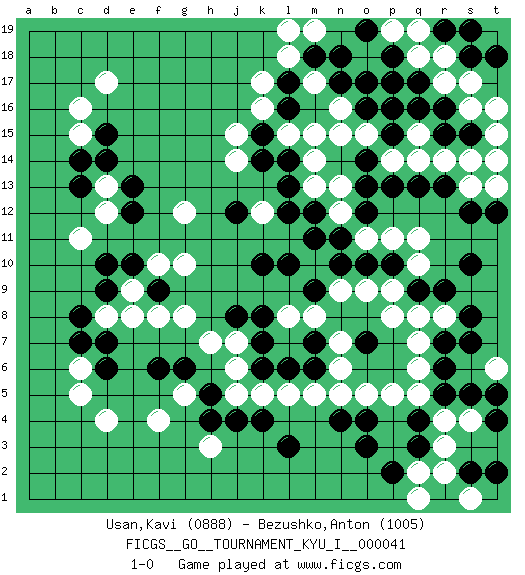 Last move : 1-0 2012 September 21 21:37:38 [Event "FICGS__GO__TOURNAMENT_KYU_I__000041"] [Site "FICGS"] [Date "2012.08.05"] [Round "1"] [Black "Usan,Kavi"] [White "Bezushko,Anton"] [Result "1-0"] [Rating 1 "0888"] [Rating 2 "1005"] 1.q16 d4 2.q3 d17 3.r9 c11 4.k4 k16 5.k10 q5 6.r5 r3 7.q4 r4 8.r6 p5 9.o3 q2 10.p2 r2 11.o4 q7 12.r7 p8 13.s5 q10 14.q9 p9 15.p10 q11 16.o10 r8 17.s8 q8 18.s10 n7 19.m7 m8 20.m6 m10 21.o12 o11 22.n11 p11 23.n10 n12 24.m11 l8 25.o13 m13 26.l10 n9 27.m9 o9 28.l13 m14 29.l14 p14 30.o14 o15 31.m12 m15 32.p15 n13 33.p13 q14 34.o16 n15 35.q13 r14 36.r13 r17 37.r16 s16 38.s15 s17 39.q17 q18 40.p18 s14 41.r15 s13 42.s12 r18 43.t18 h3 44.d6 c6 45.c7 c5 46.d7 f4 47.g6 s4 48.s2 s1 49.t2 q1 50.t4 t6 51.t5 q6 52.s7 o18 53.p17 p19 54.n18 n16 55.n17 q15 56.p16 t15 57.o17 q19 58.s19 t16 59.t14 t13 60.t12 t14 61.l17 k17 62.l16 m17 63.m18 l15 64.k15 l18 65.o19 m19 66.r19 l19 67.s18 k12 68.l12 j15 69.k14 j14 70.j8 n6 71.o7 m5 72.l6 l5 73.k6 o5 74.n4 n5 75.l3 k5 76.j4 j6 77.k7 j7 78.k8 j5 79.h4 g5 80.h5 h7 81.f6 g8 82.e10 g10 83.e12 g12 84.d15 c15 85.c14 c16 86.c13 e9 87.f9 f8 88.d9 e8 89.d10 f10 90.j12 d8 91.c8 d12 92.e13 d13 93.d14 1-0 Here are the names of the openings (joseki) played in the four corners : Corner q16 : q16 q11 Hoshi (Hwajeom, Seongjeom, Xingwei`) 4-4 Point. The star or hoshi (4-4) point, emphasizing influence at the potential expense of territory. Player Black won this Go (weiqi, baduk) game. Follow this game move after move (download)If there is no stone on the handicap point, the carpenter's square is dead. (Anonymous) There is no vagueness without wind. (Chinese proverb)