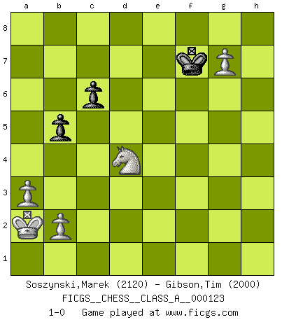 Last move : 1-0 2012 November 3 23:14:49 [Event "FICGS__CHESS__CLASS_A__000123"] [Site "FICGS"] [Date "2012.08.05"] [Round "1"] [White "Soszynski,Marek"] [Black "Gibson,Tim"] [Result "1-0"] [WhiteElo "2120"] [BlackElo "2000"] 1.d4 h5 2.Nc3 d5 3.e4 dxe4 4.Nxe4 Nf6 5.Bd3 e5 6.Qe2 Bg4 7.f3 Bf5 8.dxe5 Nxe4 9.Bxe4 Bxe4 10.Qxe4 Nc6 11.Bd2 Qe7 12.f4 O-O-O 13.O-O-O Qe6 14.Kb1 Rd4 15.Qe2 Nb4 16.Bxb4 Rxd1+ 17.Qxd1 Bxb4 18.Nh3 Qc6 19.Ng5 f6 20.Nf7 Rf8 21.Qxh5 Qxg2 22.Qf5+ Kb8 23.Rd1 fxe5 24.Qd7 a5 25.a3 Bc5 26.fxe5 Qe2 27.e6 a4 28.Rd3 Qf2 29.h3 g5 30.Ka2 Qxc2 31.Rc3 Qf5 32.Rc4 Rc8 33.Rxa4 c6 34.Ra5 Rg8 35.Nh6 Qc2 36.Nxg8 Qc4+ 37.Kb1 Qe4+ 38.Ka1 Qe1+ 39.Ka2 Qxa5 40.e7 Bxe7 41.Nxe7 Qc5 42.Qc8+ Ka7 43.Qe6 Kb6 44.Ng8 Ka7 45.Nf6 Qa5 46.Nd7 Qc7 47.Qf5 b5 48.Nc5 Kb6 49.Qxg5 Qf7+ 50.Nb3 Kb7 51.h4 Kc8 52.h5 Kd7 53.h6 Ke6 54.Qg7 Qxg7 55.hxg7 Kf7 56.Nd4 1-0 Queen's pawn Queenside Castling by player Black (move 12) Queenside Castling by player White (move 13) 10 pieces endgame at move 49 : White KQNPPP , Black KQPP WHITE : King + 1 Queen 1 Knight 3 Pawns BLACK : King + 1 Queen 2 Pawns 9 pieces endgame at move 54 : White KNPPP , Black KQPP WHITE : King + 1 Knight 3 Pawns BLACK : King + 1 Queen 2 Pawns 8 pieces endgame at move 55 : White KNPPP , Black KPP WHITE : King + 1 Knight 3 Pawns BLACK : King + 2 Pawns Player White won this chess game. Follow this game move after move (download)Everything is in a state of flux, and this includes the world of Chess. (Mikhail Botvinnik) Um dein Spiel zu verbessern musst du zuallererst das Endspiel studieren, denn diese kann unabhängig studiert werden. Die Eröffnung und das Mittelspiel müssen immer in Bezug gesetzt werden zum Endspiel. (José Raúl Capablanca) La última cosa en que Fischer estaba interesado era en tonterías, siempre y cuando el Ajedrez estuviera involucrado. (Elie Agur) Seul un grand joueur sait à quel point il joue faiblement. (Xavier Tartacover) Locking firmely the window serves nothing, only small thiefs pass through there, the big thiefs enter through the front door. (Luc-Olivier Leclerc)