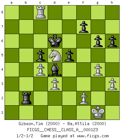 Last move : 1/2-1/2 2012 September 23 20:56:46 [Event "FICGS__CHESS__CLASS_A__000123"] [Site "FICGS"] [Date "2012.08.05"] [Round "1"] [White "Gibson,Tim"] [Black "Ba,Attila"] [Result "1/2-1/2"] [WhiteElo "2000"] [BlackElo "2000"] 1.Na3 e5 2.Nc4 Nc6 3.e4 Nf6 4.d3 d5 5.exd5 Qxd5 6.Be2 Be7 7.Nf3 O-O 8.a4 h6 9.c3 Be6 10.Qc2 a6 11.h3 b5 12.Ne3 Qd6 13.axb5 axb5 14.Rxa8 Rxa8 15.O-O Qc5 16.Nd2 Nd5 17.Ne4 Qa7 18.Ng3 Bc5 19.Nef5 b4 20.Bf3 bxc3 21.bxc3 Bf8 22.Ne3 Qa5 23.Bxd5 Bxd5 24.Bb2 Rb8 25.Ra1 Qb5 26.c4 Qxb2 27.Qxb2 Rxb2 28.Nxd5 Nb4 29.Nxb4 Bxb4 30.Ra7 Bc5 31.Ra8+ Kh7 32.Ne4 Bd4 33.g4 g6 34.Rc8 c5 35.Rc7 Kg8 36.Nf6+ Kf8 37.Rc8+ Ke7 38.Nd5+ Kd6 39.Rd8+ Kc6 40.Rc8+ Kd6 41.Rd8+ Kc6 42.Rc8+ Kd6 1/2-1/2 Durkin's attack Kingside Castling by player Black (move 7) Kingside Castling by player White (move 15) This chess game ended in a draw. Follow this game move after move (download)Chess is no whit inferior to the violin, and we have a large number of professional violinists. (Mikhail Botvinnik) Das Schachspiel übertrifft alle anderen Spiele so weit wie der Chimborasso einen Misthaufen. (Arthur Schopenhauer) En un gambito tu regalas un Peón por el bién de tomar un juego perdido. (Samuel Standige Boden) Ne tendez aucun piège pour le plaisir ! Ne jouez rien dans l'espoir que l'adversaire réagisse de façon stupide ! Prenez toujours pour acquis que l'adversaire va trouver le meilleur coup ! Ne jouez jamais de coup dans l'espoir que l'adversaire ne voie pas la menace ! Chacun de vos coups doit améliorer la position d'une façon ou d'une autre. It is a good thing for an uneducated man to read books of quotations. (Winston Churchill)