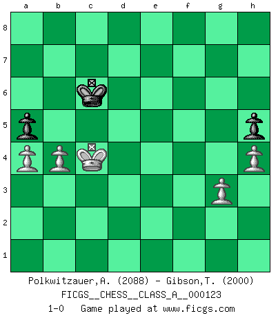 Last move : 1-0 2013 April 17 1:53:26 [Event "FICGS__CHESS__CLASS_A__000123"] [Site "FICGS"] [Date "2012.08.05"] [Round "1"] [White "Polkwitzauer,Ardiantez"] [Black "Gibson,Tim"] [Result "1-0"] [WhiteElo "2088"] [BlackElo "2000"] 1.e4 h5 2.d4 e6 3.Nf3 Be7 4.Nc3 g5 5.h3 d5 6.exd5 exd5 7.Bd3 Nc6 8.Qe2 Kf8 9.Be3 Kg7 10.O-O-O Nh6 11.a3 a6 12.h4 g4 13.Ne5 Nxe5 14.dxe5 c6 15.f3 Nf5 16.Bxf5 Bxf5 17.Qf2 Qc7 18.Ne2 Rae8 19.Rdf1 Bd8 20.Ng3 Qd7 21.Bd4 Qe6 22.Qe3 Bg6 23.fxg4 Qxg4 24.Rf4 Qe6 25.Rhf1 Kh7 26.Nf5 c5 27.Bxc5 Qxe5 28.Qxe5 Rxe5 29.Bd4 f6 30.Bxe5 fxe5 31.R4f3 Re8 32.g3 Re6 33.Re1 e4 34.R3f1 Re5 35.Nd4 Re8 36.Rd1 Bb6 37.c3 e3 38.Rde1 Bd3 39.Rf6 Bxd4 40.cxd4 a5 41.Rf3 Rc8+ 42.Kd1 Be4 43.Rfxe3 Rc4 44.Rc3 Rxd4+ 45.Ke2 b5 46.Rd1 Rc4 47.Rxc4 bxc4 48.Ke3 Kg6 49.Rf1 Kg7 50.Rf4 Bh7 51.Kd4 Be4 52.Rxe4 dxe4 53.Kxe4 Kf6 54.a4 Ke6 55.Kd4 Kd6 56.Kxc4 Kc6 57.b4 1-0 King's pawn Opening Queenside Castling by player White (move 10) 10 pieces endgame at move 52 : White KPPPP , Black KPPPP WHITE : King + 4 Pawns BLACK : King + 4 Pawns 9 pieces endgame at move 53 : White KPPPP , Black KPPP WHITE : King + 4 Pawns BLACK : King + 3 Pawns 8 pieces endgame at move 56 : White KPPPP , Black KPP WHITE : King + 4 Pawns BLACK : King + 2 Pawns Player White won this chess game. Follow this game move after move (download)Every Pawn is a potential Queen. (James Mason) Gewinnen beim Schach fördert das Selbstvertrauen. Beim Sex spüre ich sowas nicht... (Garry Kasparov) En el Ajedrez, tal como en la vida, las bendiciones de hoy pueden ser el veneno del mañana. (Assaic) 'L'échange des dames est un coup dur pour les deux adversaires...' Un journaliste lors d'une partie du match Spassky-Fischer Empty your mind, be formless, shapeless — like water. (Bruce Lee)