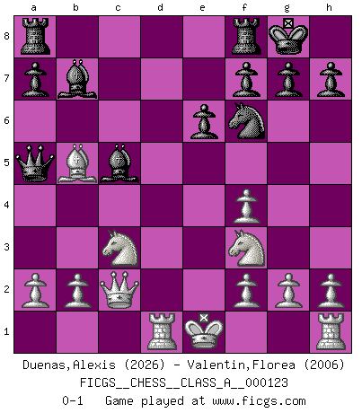Last move : 0-1 2012 September 28 20:9:32 [Event "FICGS__CHESS__CLASS_A__000123"] [Site "FICGS"] [Date "2012.08.05"] [Round "1"] [White "Duenas,Alexis"] [Black "Valentin,Florea"] [Result "0-1"] [WhiteElo "2026"] [BlackElo "2006"] 1.d4 Nf6 2.c4 e6 3.Nc3 Bb4 4.Qc2 O-O 5.Nf3 c5 6.dxc5 Bxc5 7.Bf4 Nc6 8.e3 d5 9.Rd1 Qa5 10.Be2 dxc4 11.Bxc4 Nb4 12.Qb1 Nbd5 13.Qc2 Nxf4 14.exf4 b5 15.Bxb5 Bb7 0-1 Nimzo-Indian : Classical variation Kingside Castling by player Black (move 4) Player Black won this chess game. Follow this game move after move (download)The defensive power of a pinned piece is only imaginary. (Aaron Nimzovich) Die FIDE ist dabei in die Hände der russischen Mafia zu fallen. (Larry Evans) Por esta medida (el intervalo entre Fischer y sus contemporaneos), yo le considero el mas grande campeón mundial. (Garry Kasparov) Les Echecs, c'est l'art de la guerre sans les charniers, c'est la résurrection des morts tombés au champ d'honneur, l'espoir perpétuel, la suprématie de l'intelligence sur la force, la culture de l'esprit. (F. Szpiner) Fame, I have already. Now I need the money. (an elderly Steinitz)