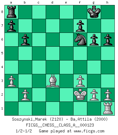 Last move : 1/2-1/2 2012 August 8 22:41:21 [Event "FICGS__CHESS__CLASS_A__000123"] [Site "FICGS"] [Date "2012.08.05"] [Round "1"] [White "Soszynski,Marek"] [Black "Ba,Attila"] [Result "1/2-1/2"] [WhiteElo "2120"] [BlackElo "2000"] 1.d4 Nf6 2.c4 e6 3.Nc3 Bb4 4.Qc2 O-O 5.a3 Bxc3+ 6.Qxc3 b6 7.Bg5 Bb7 8.e3 d6 9.Ne2 Nbd7 10.Qc2 Qe7 11.Nc3 c5 12.Rd1 cxd4 13.Rxd4 Rfd8 14.f3 d5 15.cxd5 exd5 16.Nxd5 Bxd5 17.Rxd5 h6 18.Bxf6 Qxe3+ 19.Qe2 Qxe2+ 20.Bxe2 Nxf6 21.Rd3 Rxd3 22.Bxd3 g6 23.Kf2 1/2-1/2 Nimzo-Indian : Classical variation Kingside Castling by player Black (move 4) This chess game ended in a draw. Follow this game move after move (download)Chess is life. (Bobby Fischer) Ich suche im Schach immer etwas Eigenes. Riskantes Spiel im Stile schachlicher Musketiere ist nicht meine Sache, auch wenn es vielen Freunden scharfer Wendungen gefällt. (Anatoly Karpov) El Ajedrez, como cualquier actividad creativa, solo puede existir a través del esfuerzo combinado de aquellos que tienen talento creativo y de aquellos que poseen la habilidad de organizar su trabajo creativo. (Mikhail Botvinnik) Karpov est une pièce de musée. (Garry Kasparov) Fear is the path to the dark side. Fear leads to anger; anger leads to hate; hate leads to suffering. I sense much fear in you. (Master Yoda in Star Wars ep.1)