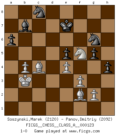 Last move : 1-0 2013 January 8 23:54:51 [Event "FICGS__CHESS__CLASS_A__000123"] [Site "FICGS"] [Date "2012.08.05"] [Round "1"] [White "Soszynski,Marek"] [Black "Panov,Dmitriy"] [Result "1-0"] [WhiteElo "2120"] [BlackElo "2092"] 1.d4 Nf6 2.c4 e6 3.Nc3 Bb4 4.Qc2 O-O 5.a3 Bxc3+ 6.Qxc3 b6 7.Bg5 Bb7 8.f3 h6 9.Bh4 d5 10.e3 Nbd7 11.cxd5 Nxd5 12.Bxd8 Nxc3 13.Bh4 Nd5 14.Bf2 c5 15.e4 Ne7 16.Ne2 Rfd8 17.O-O-O cxd4 18.Nxd4 Nc5 19.Be2 Ng6 20.Be3 Rac8 21.Kb1 Kf8 22.Ka2 Kg8 23.h4 h5 24.Bb5 a6 25.Be2 Na4 26.Rhg1 Ne5 27.Rc1 Kf8 28.Rxc8 Rxc8 29.Rc1 Rxc1 30.Bxc1 Ke7 31.Bd2 f6 32.Kb3 Nc5+ 33.Kc2 Ng6 34.b4 Nd7 35.Be1 b5 36.Bf2 Nge5 37.Kb3 g6 38.a4 bxa4+ 39.Kxa4 Nb6+ 40.Ka3 g5 41.Kb3 Nc8 42.Bg3 Ng6 43.hxg5 fxg5 44.Bc4 h4 45.Bf2 e5 46.Nf5+ 1-0 Nimzo-Indian : Classical variation Kingside Castling by player Black (move 4) Queenside Castling by player White (move 17) Player White won this chess game. Follow this game move after move (download)Let the perfectionist play postal. (Yasser Seirawan) Ohne ihre Erfolge schmälern zu wollen würde ich sagen Petrosian, Spassky und Karpov verdanken ihre Siege ihren Trainern - Boleslavsky, Bondarevsky und Furman. (Mikhail Moiseyevich Botvinik) Tu cuerpo tiene que estar en óptima condición. Tu Ajedrez se deteriora como lo hace tu cuerpo. No puedes separar la mente y el cuerpo. (Bobby Fischer) Aucun coup ne doit être joué sans but. (Pedro Damiano) The hypothalamus is one of the most important parts of the brain, involved in many kinds of motivation, among other functions. The hypothalamus controls the 'Four Fs: Fighting, Fleeing, Feeding and Mating. (Unknown author)
