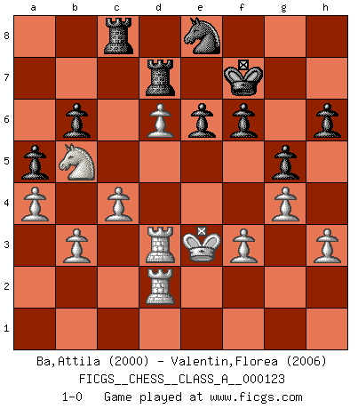 Last move : 1-0 2013 March 12 17:36:0 [Event "FICGS__CHESS__CLASS_A__000123"] [Site "FICGS"] [Date "2012.08.05"] [Round "1"] [White "Ba,Attila"] [Black "Valentin,Florea"] [Result "1-0"] [WhiteElo "2000"] [BlackElo "2006"] 1.d4 Nf6 2.c4 e6 3.Nf3 b6 4.g3 Ba6 5.Qa4 Bb7 6.Bg2 c5 7.dxc5 Bxc5 8.O-O O-O 9.Nc3 a5 10.Bf4 d6 11.Rad1 Qc7 12.Nb5 Qe7 13.Bxd6 Bxd6 14.Nxd6 Bc6 15.Qa3 Ra7 16.Ne5 Bxg2 17.Kxg2 Nfd7 18.Nd3 Nc6 19.Nb5 Qxa3 20.Nxa3 Rd8 21.Nb5 R7a8 22.b3 Kf8 23.Nc3 Nb4 24.Rd2 Nxd3 25.exd3 Nf6 26.Rfd1 Rd7 27.d4 Rad8 28.h3 g5 29.f3 Kg7 30.Kf2 h6 31.Rd3 Kf8 32.R1d2 Nh5 33.d5 Nf6 34.d6 Ne8 35.Nb5 f6 36.Ke3 Kf7 37.g4 Rc8 38.a4 1-0 This chess game has been lost on time (started : 2012.08.05 16:10:29) Queen's Indian : Nimzovich variation (exaggerated Fianchetto) Kingside Castling by player White (move 8) Kingside Castling by player Black (move 8) Player White won this chess game. Follow this game move after move (download)When the Chess game is over, the Pawn and the King go back to the same box. (Irish saying) Sie bekommen vielleicht den Eindruck, dass die Spitzenspieler überhaupt gar nicht so stark sind. Aber das stimmt nicht. Es ist eine Illusion. Mit einem Computer an der Seite ist es sehr leicht, Urteile zu fällen, aber wenn man alleine am Brett sitzt, sieht die Sache ganz anders aus. (Vladimir Kramnik) Bobby es el jugador de Ajedrez mas fino que este país jamás haya producido. Su memoria para las movidas, su brillantez en soñar combinaciones y su feróz determinación por la victoria son algo extraño. (John Collins) Mais n'est-ce pas déjà le limiter injurieusement que d'appeler les échecs un jeu? N'est-ce pas aussi une science, un art, ou quelque chose qui, comme le cercueil de Mahomet entre ciel et terre, est suspendu entre l'un et l'autre, et qui réunit un nombre incroyable de contraires ? (Stefan Zweig) Don't be irreplaceable, if you can't be replaced, you can't be promoted. (Dan Rotaru)