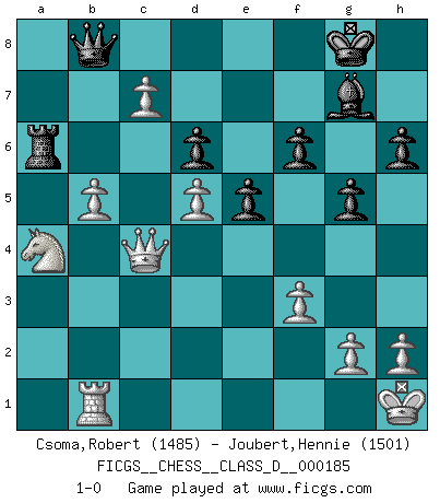 Last move : 1-0 2012 October 9 20:32:24 [Event "FICGS__CHESS__CLASS_D__000185"] [Site "FICGS"] [Date "2012.08.07"] [Round "1"] [White "Csoma,Robert"] [Black "Joubert,Hennie"] [Result "1-0"] [WhiteElo "1485"] [BlackElo "1501"] 1.Nf3 Nf6 2.c4 g6 3.Nc3 Bg7 4.d4 O-O 5.e4 d6 6.Be2 Nbd7 7.O-O e5 8.d5 Nc5 9.Qc2 Ne8 10.b4 Nd7 11.Bg5 f6 12.Bh4 g5 13.Bg3 Nb8 14.Bd3 Bg4 15.Nd2 Nd7 16.f3 Bh5 17.Bf2 h6 18.c5 a6 19.c6 bxc6 20.dxc6 Nb6 21.Bxb6 cxb6 22.Nd5 b5 23.a4 Bf7 24.axb5 Bxd5 25.exd5 Qb6+ 26.Kh1 Nc7 27.bxa6 Nxa6 28.Rxa6 Rxa6 29.Bxa6 Qxa6 30.Qc4 Qb6 31.Ne4 Qc7 32.b5 Rb8 33.Rb1 Rb6 34.Nc3 Qb8 35.Na4 Ra6 36.c7 1-0 Reti Opening Kingside Castling by player Black (move 4) Kingside Castling by player White (move 7) Player White won this chess game. Follow this game move after move (download)Every Chess master was once a beginner. (Chernev) Dieses schreckliche Gefühl, dass ich gegen eine Maschine spielte, die niemals Fehler macht, zerschmetterte meinen Widerstand. (Mark Taimanov) El Ajedrez es un juego terrible. Si no dominas el centro, tu oponente tiene una posición mas libre. Si tu tienes el centro, entonces realmente tienes algo de que preocuparte. (Siegbert Tarrasch) Lorsque vous vous retrouvez devant une position atroce, ne tendez pas un ultime piège dérisoire avec l'intention d'abandonner si l'adversaire le déjoue ! Faites-vous plutôt un devoir de résister comme si votre vie en dépendait. Jouez le coup qui vous déplairait au centuple si vous étiez dans la peau de votre tortionnaire ! Even the best needles are not sharp at both ends. (Chinese proverb)