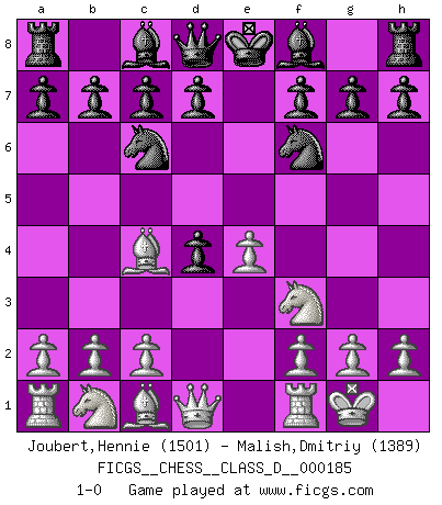 Last move : 1-0 2012 September 19 19:34:15 [Event "FICGS__CHESS__CLASS_D__000185"] [Site "FICGS"] [Date "2012.08.07"] [Round "1"] [White "Joubert,Hennie"] [Black "Malish,Dmitriy"] [Result "1-0"] [WhiteElo "1501"] [BlackElo "1389"] 1.e4 e5 2.Nf3 Nc6 3.Bc4 Nf6 4.d4 exd4 5.O-O 1-0 This chess game has been lost on time (started : 2012.08.07 0:31:13) Two knights defense Kingside Castling by player White (move 5) Player White won this chess game. Follow this game move after move (download)Chess is a fighting game which is purely intellectual and includes chance. (Richard Reti) Das Spiel gibt uns die Genugtuung, die das Leben uns versagt. (Emanuel Lasker) Por la belleza de sus partidas, la claridad de su juego y lo brillante de sus ideas, Fischer se creó el mismo como un artista de la misma estatura como Brahms, Rembrandt y Shakespeare. (David Levy) L'ordinateur a tué l'originalité. Il n'y a plus guère d'aventures sur l'échiquier. (Jacob Murray) When you stop learning you start dying. (Scott Adams)
