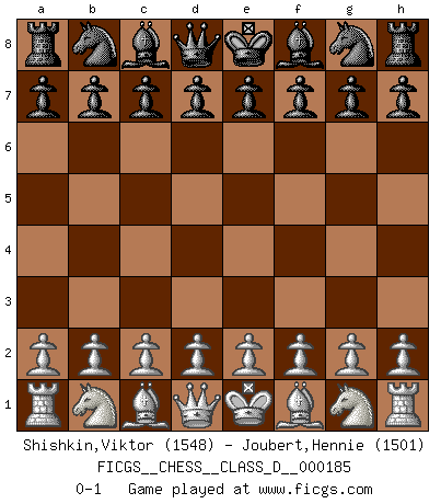Last move : 0-1 2012 September 16 7:22:46 [Event "FICGS__CHESS__CLASS_D__000185"] [Site "FICGS"] [Date "2012.08.07"] [Round "1"] [White "Shishkin,Viktor"] [Black "Joubert,Hennie"] [Result "0-1"] [WhiteElo "1548"] [BlackElo "1501"] 0-1 This chess game has been lost on time (started : 2012.08.07 0:31:13) Player Black won this chess game. Follow this game move after move (download)We don't really know how the game was invented, though there are suspicions. As soon as we discover the culprits, we'll let you know. (Bruce Pandolfini) Ich brauche nur einen Blick auf das Schachbrett zu werfen, und weiß schon, was in der Stellung steckt, was geschehen kann und was geschehen wird. Alle übrigen suchen und prüfen, ich aber weiß es! (José Raúl Capablanca) El jugador de combinación piensa hacia adelante; comienza de la posición dada y trabaja las movidas contundentes en su mente. (Emanuel Lasker) Il vaut toujours mieux jouer un plan faux de façon logique que de n'avoir pas de plan du tout. (Victor Kortchnoï) Creativity is inventing, experimenting, growing, taking risks, breaking rules, making mistakes, and having fun. (Mary Lou Cook)