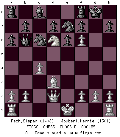 Last move : 1-0 2012 November 1 13:35:23 [Event "FICGS__CHESS__CLASS_D__000185"] [Site "FICGS"] [Date "2012.08.07"] [Round "1"] [White "Pech,Stepan"] [Black "Joubert,Hennie"] [Result "1-0"] [WhiteElo "1403"] [BlackElo "1501"] 1.e4 c5 2.Nf3 e6 3.d4 cxd4 4.Nxd4 Nf6 5.Nc3 Qb6 6.e5 Bc5 7.Ndb5 Nd5 8.Ne4 O-O 9.c4 Bb4+ 10.Bd2 Bxd2+ 11.Qxd2 a6 12.Nbd6 Ne7 13.Bd3 Nbc6 14.Nf6+ gxf6 15.exf6 1-0 Sicilian : Anderssen variation Kingside Castling by player Black (move 8) Player White won this chess game. Follow this game move after move (download)I have never in my life played the French Defence, which is the dullest of all openings. (Wilhelm Steinitz) Habe Mut, dich deines eigenen Verstandes zu bedienen. (Immanuel Kant) Una mala movida nulifica cuarenta buenas. (Horowitz) On entre au jeu d'Echecs comme on entre en Religion. Pour le joueur d'Echecs, la partie d'Echecs c'est l'office, la messe, le défilé du 1er Mai, le dépôt de gerbe au Monument aux Morts. C'est un drame sacré. (Michel Roos) Work expands to fill the time available. (C. Northcote Parkinson, in Parkinson's Laws)