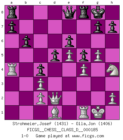 Last move : 1-0 2013 March 10 5:28:20 [Event "FICGS__CHESS__CLASS_D__000185"] [Site "FICGS"] [Date "2012.08.07"] [Round "1"] [White "Strohmeier,Josef"] [Black "Olla,Jon"] [Result "1-0"] [WhiteElo "1431"] [BlackElo "1406"] 1.e4 e6 2.d4 d5 3.Nc3 Bb4 4.e5 c5 5.a3 Bxc3+ 6.bxc3 c4 7.f4 Qh4+ 8.g3 Qd8 9.Nf3 Ne7 10.Be2 b6 11.O-O O-O 12.Bd2 Na6 13.g4 Nc7 14.Qe1 Bd7 15.Nh4 f5 16.g5 Ba4 17.Bd1 Qe8 18.Rb1 Nb5 19.Rb4 Nxa3 20.Rb2 Nc6 21.Ra2 Nb1 22.Rxa4 Nxd2 23.Qxd2 Nxe5 24.dxe5 1-0 French : Winawer, Advance variation Kingside Castling by player White (move 11) Kingside Castling by player Black (move 11) Player White won this chess game. Follow this game move after move (download)Pawn endings are to Chess what putting is to golf. (Cecil Purdy) Ohne Fehler kann es keine Brillanz geben. (Emanuel Lasker) El Ajedrez es despiadado: debes de estar preparado para matar gente. (Nigel Short) Mais l'homme est une créature légère et illogique : semblable au joueur d'échecs, il n'aime que le processus du but à atteindre, non le but lui-même. (Dostoïevsky) Always be a first-rate version of yourself, instead of a second-rate version of somebody else. (Judy Garland)