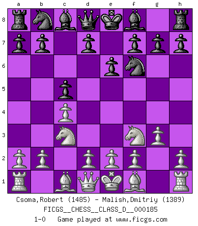Last move : 1-0 2012 September 21 7:51:32 [Event "FICGS__CHESS__CLASS_D__000185"] [Site "FICGS"] [Date "2012.08.07"] [Round "1"] [White "Csoma,Robert"] [Black "Malish,Dmitriy"] [Result "1-0"] [WhiteElo "1485"] [BlackElo "1389"] 1.Nf3 Nf6 2.c4 c5 3.Nc3 e6 4.g3 1-0 This chess game has been lost on time (started : 2012.08.07 0:31:13) Reti Opening Player White won this chess game. Follow this game move after move (download)I guess a certain amount of temperament is expected of Chess geniuses. (Ron Gross) Wie gewinnt Tal? Er entwickelt alle seine Figuren in die Brettmitte und opfert sie dann irgendwo. (Robert James Fischer) No volvere nunca a jugar contigo. Has insultado a mi amigo. - cuando un oponente se maldijo por una mala jugada (Miguel Najdorf) Avec des compensations pour le matériel en plus... (Anonyme) Ah, beer! The cause of, and the solution to, all of life's problems. (Homer Simpson)