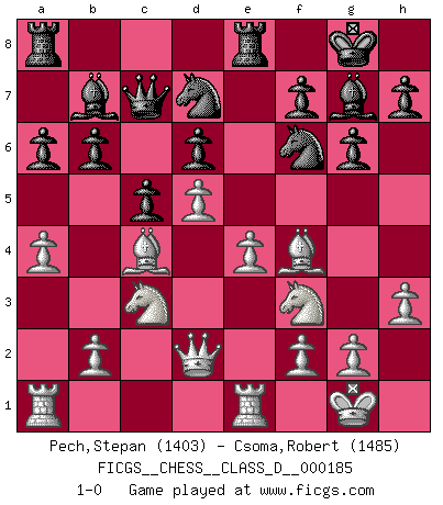 Last move : 1-0 2013 January 20 0:36:32 [Event "FICGS__CHESS__CLASS_D__000185"] [Site "FICGS"] [Date "2012.08.07"] [Round "1"] [White "Pech,Stepan"] [Black "Csoma,Robert"] [Result "1-0"] [WhiteElo "1403"] [BlackElo "1485"] 1.d4 Nf6 2.c4 c5 3.d5 e6 4.Nc3 exd5 5.cxd5 d6 6.e4 g6 7.Nf3 Bg7 8.h3 O-O 9.Bd3 a6 10.a4 b6 11.O-O Nbd7 12.Bf4 Qc7 13.Re1 Re8 14.Qd2 Bb7 15.Bc4 1-0 Benoni : Classical with e4 and Nf3 Kingside Castling by player Black (move 8) Kingside Castling by player White (move 11) Player White won this chess game. Follow this game move after move (download)After a bad opening, there is hope for the middle game. After a bad middle game, there is hope for the endgame. But once you are in the endgame, the moment of truth has arrived. (Edmar Mednis) Schach wird sich dank seiner hohen kulturellen Tradition immer durchsetzen. In näherer Zukunft womöglich sogar als Gegenreaktion auf die maßlose Reizüberflutung im Freizeit- und Spielbereich. (Garry Kasparov) Tu puedes aprender mucho mas de una partida que pierdas que de una partida ganada. Tendras que perder cientos de partidas antes de llegar a ser un buen jugador. (Jose Raul Capablanca) Mais n'est-ce pas déjà le limiter injurieusement que d'appeler les échecs un jeu? N'est-ce pas aussi une science, un art, ou quelque chose qui, comme le cercueil de Mahomet entre ciel et terre, est suspendu entre l'un et l'autre, et qui réunit un nombre incroyable de contraires ? (Stefan Zweig) But they are useless. They can only give you answers. (Pablo Picasso, about computers)