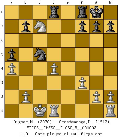 Last move : 1-0 2006 November 14 10:59:30 [Event "FICGS__CHESS__CLASS_B__000003"] [Site "FICGS"] [Date "2006.05.14"] [Round "1"] [White "Aigner,Michael"] [Black "Grosdemange,David"] [Result "1-0"] [WhiteElo "2070"] [BlackElo "1912"] 1.d4 c5 2.dxc5 e6 3.Nd2 Nf6 4.Nb3 a5 5.a4 Na6 6.Be3 Qc7 7.Nf3 Nxc5 8.Bxc5 Bxc5 9.Nxc5 Qxc5 10.c3 O-O 11.e3 d6 12.Qd4 Qxd4 13.Nxd4 Bd7 14.f3 d5 15.Bb5 e5 16.Bxd7 Nxd7 17.Nb5 Nc5 18.Nc7 Rad8 19.O-O-O d4 20.exd4 exd4 21.cxd4 1-0 This chess game has been lost on time (started : 2006.05.14 11:15:1) Old Benoni defense Kingside Castling by player Black (move 10) Queenside Castling by player White (move 19) Player White won this chess game. Follow this game move after move (download)You sit at the board and suddenly your heart leaps. Your hand trembles to pick up the piece and move it. But what Chess teaches you is that you must sit there calmly and think about whether it's really a good idea and whether there are other better ideas. (Stanley Kubrick) Karpov ist ein Museumsstück. (Garry Kasparov) Tu cuerpo tiene que estar en óptima condición. Tu Ajedrez se deteriora como lo hace tu cuerpo. No puedes separar la mente y el cuerpo. (Bobby Fischer) Ce n'est pas pour s'amuser qu'il joue aux échecs : il célèbre un culte. (Vladimir Nabokov) Life is like internet, nothing interesting, but noone want to leave it. (Ilmars Cirulis)
