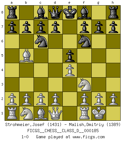 Last move : 1-0 2012 October 8 21:35:33 [Event "FICGS__CHESS__CLASS_D__000185"] [Site "FICGS"] [Date "2012.08.07"] [Round "1"] [White "Strohmeier,Josef"] [Black "Malish,Dmitriy"] [Result "1-0"] [WhiteElo "1431"] [BlackElo "1389"] 1.e4 e5 2.Nf3 Nc6 3.Bb5 Nf6 4.O-O 1-0 This chess game has been lost on time (started : 2012.08.07 0:31:13) Ruy Lopez : Berlin defense, 4.O-O Kingside Castling by player White (move 4) Player White won this chess game. Follow this game move after move (download)Chess is a terrific way for kids to build self image and self esteem. (Saudin Robovic) Mein Name ist Rustam Kamsky. Sie haben meinen Sohn belästigt. Bereiten Sie sich aufs Sterben vor. (Rustam Kamsky) Realmente no sabemos como el juego fue inventado, aunque hay sospechas. Tan pronto como descubramos a los culpables, se los haremos saber. (Bruce Pandolfini) Demandez au pauvre Cg1 ce qu'il en pense. Eduard Gufeld à propos de la variante Saemisch de l'Est-Indienne. Chess, like love, like music, has the power to make people happy. (Siegbert Tarrasch)