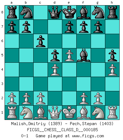 Last move : 0-1 2012 October 4 21:17:41 [Event "FICGS__CHESS__CLASS_D__000185"] [Site "FICGS"] [Date "2012.08.07"] [Round "1"] [White "Malish,Dmitriy"] [Black "Pech,Stepan"] [Result "0-1"] [WhiteElo "1389"] [BlackElo "1403"] 1.e4 c6 2.d4 d5 3.e5 Bf5 4.h4 h5 0-1 This chess game has been lost on time (started : 2012.08.07 0:31:13) Caro-Kann : Advance variation Player Black won this chess game. Follow this game move after move (download)Blessed be the memory of him who gave the world this immortal game. (A. G. Gardiner) Ich bin Weltmeister und muß mit niemandem irgend etwas diskutieren. (Viswanathan Anand) Por la belleza de sus partidas, la claridad de su juego y lo brillante de sus ideas, Fischer se creó el mismo como un artista de la misma estatura como Brahms, Rembrandt y Shakespeare. (David Levy) RxDa4 pat (...) You think that education is too expensive ? Try ignorance. (Derek Bok)