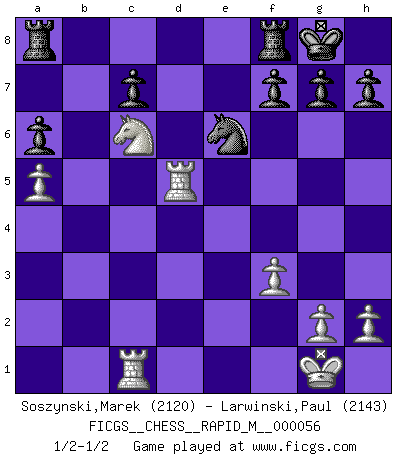 Last move : 1/2-1/2 2012 August 10 20:2:33 [Event "FICGS__CHESS__RAPID_M__000056"] [Site "FICGS"] [Date "2012.08.07"] [Round "1"] [White "Soszynski,Marek"] [Black "Larwinski,Paul"] [Result "1/2-1/2"] [WhiteElo "2120"] [BlackElo "2143"] 1.d4 d5 2.c4 dxc4 3.e4 e5 4.Nf3 exd4 5.Bxc4 Nc6 6.O-O Be6 7.Bb5 Bc5 8.b4 Bb6 9.a4 a6 10.Bxc6+ bxc6 11.a5 Ba7 12.Bb2 Nf6 13.Bxd4 Nxe4 14.Bxa7 Qxd1 15.Rxd1 Rxa7 16.Nd4 c5 17.Nc6 Ra8 18.f3 Nf6 19.bxc5 Nd7 20.Nc3 Nxc5 21.Nd5 Bxd5 22.Rxd5 Ne6 23.Rc1 O-O 1/2-1/2 QGA : 3.e4 Kingside Castling by player White (move 6) Kingside Castling by player Black (move 23) This chess game ended in a draw. Follow this game move after move (download)Could we look into the head of a Chess player, we should see there a whole world of feelings, images, ideas, emotion and passion. (Alfred Binet) Ein Großmeister muß tausende Partien in seinem Kopf speichern, denn diese sind für Ihn, was die Worte der Muttersprache für gewöhnliche Leute sind, oder Noten für Musiker... (Garry Kasparov) El Ajedrez es un expediente tonto que hace creer a la gente inactiva que hacen una cosa muy astuta cuando solamente estan perdiendo su tiempo. (George Bernard Shaw) Fischer est le meilleur joueur du monde et Karpov n'est qu'un joueur de bistrot. (Garry Kasparov, agé de 16 ans) The worth of a book is to be measured by what you can carry away from it. (James Bryce)