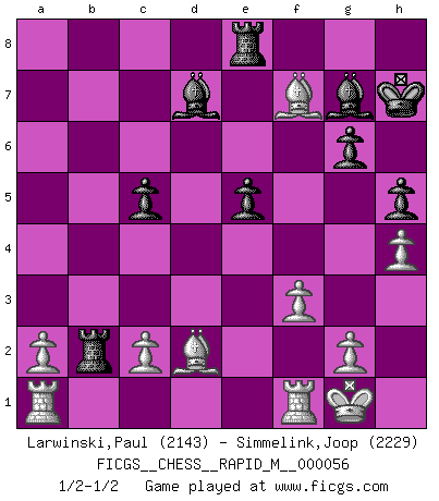 Last move : 1/2-1/2 2012 August 11 21:18:19 [Event "FICGS__CHESS__RAPID_M__000056"] [Site "FICGS"] [Date "2012.08.07"] [Round "1"] [White "Larwinski,Paul"] [Black "Simmelink,Joop"] [Result "1/2-1/2"] [WhiteElo "2143"] [BlackElo "2229"] 1.e4 c5 2.Nf3 d6 3.d4 cxd4 4.Nxd4 Nf6 5.Nc3 g6 6.Be3 Bg7 7.f3 Nc6 8.Qd2 O-O 9.Bc4 Bd7 10.h4 Rb8 11.Bb3 h5 12.Nxc6 bxc6 13.Bxa7 Rb7 14.Be3 Qa5 15.O-O c5 16.Nd5 Qxd2 17.Nxe7+ Kh7 18.Bxd2 Re8 19.e5 dxe5 20.Nd5 Nxd5 21.Bxd5 Rxb2 22.Bxf7 1/2-1/2 Sicilian : Dragon, Yugoslav attack Kingside Castling by player Black (move 8) Kingside Castling by player White (move 15) This chess game ended in a draw. Follow this game move after move (download)I'd rather have a Pawn than a finger. (Reuben Fine) Das Schach ist nichts für kleine Geister, es beansprucht einen vollen Mann, der sich nicht sklavisch an das Überlieferte hält, sondern selbständig die Tiefen des Spiels zu ergründen sucht. (Wilhelm Steinitz) La batalla por la última verdad nunca sera ganada. Y es por eso que el Ajedrez es tan fascinante. (Hans Kmoch) Avec des compensations pour le matériel en plus... (Anonyme) Life doesn't imitate art, it imitates bad television. (Woody Allen)