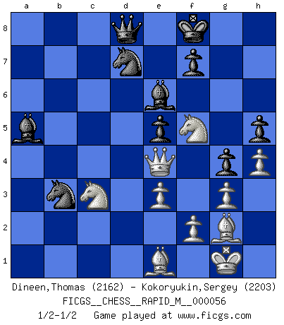 Last move : 1/2-1/2 2012 December 6 22:17:41 [Event "FICGS__CHESS__RAPID_M__000056"] [Site "FICGS"] [Date "2012.08.07"] [Round "1"] [White "Dineen,Thomas"] [Black "Kokoryukin,Sergey"] [Result "1/2-1/2"] [WhiteElo "2162"] [BlackElo "2203"] 1.d4 Nf6 2.c4 e6 3.Nf3 b6 4.g3 Ba6 5.Qa4 Be7 6.Bg2 Bb7 7.O-O c5 8.dxc5 bxc5 9.Nc3 O-O 10.Rd1 Qb6 11.Bf4 d6 12.Rab1 Nbd7 13.b4 Rfb8 14.a3 h6 15.Qc2 g5 16.Bd2 cxb4 17.axb4 Rc8 18.c5 Qc7 19.cxd6 Bxd6 20.Qb2 Bf8 21.Rbc1 Qd8 22.b5 a6 23.bxa6 Bxa6 24.Nd4 Rab8 25.Qa2 Bc4 26.Qa1 Nc5 27.Be1 Qe8 28.Rb1 e5 29.Rxb8 Rxb8 30.Nf5 Bb3 31.Rb1 Be6 32.Rxb8 Qxb8 33.Ne3 Nb3 34.Qb2 Bb4 35.Qb1 Qd8 36.Nf5 h5 37.h3 Ba5 38.e3 g4 39.h4 Kf8 40.Qc2 Nd7 41.Qe4 1/2-1/2 Queen's Indian : Nimzovich variation (exaggerated Fianchetto) Kingside Castling by player White (move 7) Kingside Castling by player Black (move 9) This chess game ended in a draw. Follow this game move after move (download)Not all artists are Chess players, but all Chess players are artists. (Marcel Duchamp) Das Spiel gibt uns die Genugtuung, die das Leben uns versagt. (Emanuel Lasker) El Ajedrez es un terrible juego. Si no controlas el centro, tu oponente tiene una posición mas holgada. Si tienes control del centro, ¡entonces realmente tu tienes algo de que preocuparte!. (Siegbert Tarrasch) Aucun coup ne doit être joué sans but. (Pedro Damiano) Whenever people agree with me, I always feel I must be wrong. (Oscar Wilde)