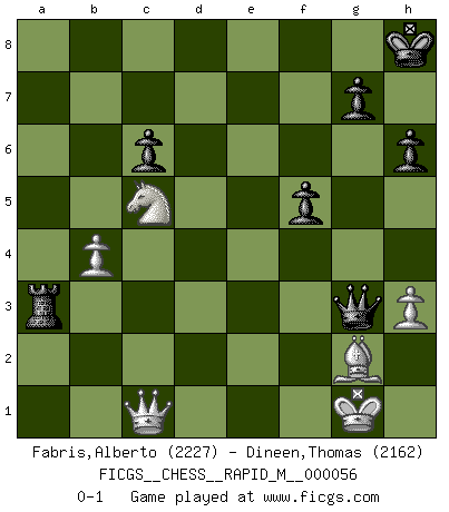 Last move : 0-1 2012 November 26 11:19:12 [Event "FICGS__CHESS__RAPID_M__000056"] [Site "FICGS"] [Date "2012.08.07"] [Round "1"] [White "Fabris,Alberto"] [Black "Dineen,Thomas"] [Result "0-1"] [WhiteElo "2227"] [BlackElo "2162"] 1.c4 e5 2.g3 Nf6 3.Bg2 Nc6 4.Nc3 Bc5 5.e3 O-O 6.Nge2 d6 7.d4 Bb6 8.O-O Bg4 9.h3 Bd7 10.b3 Qc8 11.Kh2 exd4 12.exd4 h6 13.a3 Re8 14.Be3 a6 15.Nf4 Ba7 16.Ncd5 Nxd5 17.Nxd5 Bf5 18.b4 Ne7 19.Nc3 Bg6 20.c5 c6 21.Bf4 Nf5 22.g4 dxc5 23.gxf5 Qxf5 24.Qd2 cxd4 25.Na4 d3 26.Rae1 Bh5 27.Be3 Bb8+ 28.f4 a5 29.Nc5 Be2 30.Rf2 Bc7 31.Nxb7 axb4 32.axb4 Ra2 33.Qxa2 Rxe3 34.Qc4 Qf6 35.Rfxe2 Bxf4+ 36.Kg1 dxe2 37.Rxe2 Bh2+ 38.Kxh2 Qe5+ 39.Kg1 Rxe2 40.Qd3 Re1+ 41.Kf2 Ra1 42.Qd8 Kh7 43.Qd2 Ra3 44.Kg1 Qg3 45.Qc1 f5 46.Nc5 Kh8 0-1 English Opening Kingside Castling by player Black (move 5) Kingside Castling by player White (move 8) Player Black won this chess game. Follow this game move after move (download)Alekhine is a poet who creates a work of art out of something that would hardly inspire another man to send home a picture post card. (Max Euwe) Ich verstehe mehr vom Schach als irgendein anderer lebender Meister. (José Raúl Capablanca) El jugador de combinación piensa hacia adelante; comienza de la posición dada y trabaja las movidas contundentes en su mente. (Emanuel Lasker) Tout change constamment, y compris dans le monde des Echecs. (Botvinnik) Now the reason the enlightened prince and the wise general conquer the enemy whenever they move and their achievements surpass those of ordinary men is foreknowledge. (Sun Tzu)