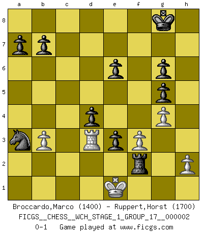 Last move : 0-1 2007 January 31 0:59:0 [Event "FICGS__CHESS__WCH_STAGE_1_GROUP_17__000002"] [Site "FICGS"] [Date "2007.01.16"] [Round "1"] [White "Broccardo,Marco"] [Black "Ruppert,Horst"] [Result "0-1"] [WhiteElo "1400"] [BlackElo "1700"] 1.e4 e6 2.d4 d5 3.Nc3 Bb4 4.e5 c5 5.Nf3 Ne7 6.Bb5+ Bd7 7.O-O Bxc3 8.Bxd7+ Nxd7 9.bxc3 O-O 10.Bg5 Nb6 11.Rb1 Qc7 12.Nh4 Rac8 13.Qg4 Rfe8 14.Bf6 Ng6 15.Bg5 cxd4 16.Qxd4 Nxe5 17.Bf4 f6 18.Kh1 Qxc3 19.Qxc3 Rxc3 20.Bxe5 fxe5 21.Rfc1 e4 22.Rb3 Rxb3 23.axb3 g5 24.Ng6 hxg6 25.g4 Rc8 26.c4 Nxc4 27.Kg1 Nd6 28.Rd1 Nb5 29.Kg2 d4 30.f3 Rc2+ 31.Kf1 e3 32.Rd3 Rf2+ 33.Ke1 Na3 0-1 French : Winawer, Advance variation Kingside Castling by player White (move 7) Kingside Castling by player Black (move 9) Player Black won this chess game. Follow this game move after move (download)The essence of Chess is thinking about what Chess is. (David Bronstein) Besser ein falscher Plan, logisch durchgeführt, als gar kein Plan. (Viktor Kortschnoi) La belleza de un movimiento no se refleja solo en su apariencia, sino en el pensamiento detrás de él. (Siegbert Tarrasch) Une platitude souvent récitée à propos des Echecs est qu'une des choses les plus difficiles à réaliser est de gagner une position gagnante. Cela ne manque pas de sens mais, pour ma part, j'ai toujours trouvé plus difficile de gagner une position perdante. (Tim Krabbe) Remember : Your focus determines your reality. (Qui-Gon Jinn in Star Wars ep.1)