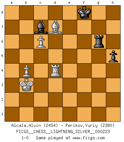 Last move : 1-0 2012 August 7 17:57:9 [Event "FICGS__CHESS__LIGHTNING_SILVER__000223"] [Site "FICGS"] [Date "2012.08.07"] [Round "1"] [White "Alcala,Alvin"] [Black "Perikov,Yuriy"] [Result "1-0"] [WhiteElo "2454"] [BlackElo "2380"] 1.e4 c5 2.Nf3 d6 3.d4 cxd4 4.Nxd4 Nf6 5.Nc3 a6 6.f3 e5 7.Nb3 Be6 8.Be3 Be7 9.Qd2 Nbd7 10.g4 h6 11.h4 b5 12.a4 b4 13.Nd5 Bxd5 14.exd5 e4 15.Bd4 exf3 16.O-O-O Nxg4 17.Bxg7 Rg8 18.Bd4 Nde5 19.Qxb4 Qc8 20.Na5 Kf8 21.Rh3 Rg6 22.Nc6 Nxc6 23.dxc6 Ne5 24.Qb3 Qxc6 25.Bxe5 dxe5 26.Rxf3 Rf6 27.Rxf6 Bxf6 28.Bc4 Rd8 29.Rf1 Rd6 30.a5 Qc7 31.Kb1 e4 32.Qb4 Kg7 33.Bxa6 Qe7 34.Qb7 Bxh4 35.Qxe7 Bxe7 36.Bb5 Rd8 37.Bc4 Rf8 38.a6 f5 39.Bd5 Bc5 40.b4 Ba7 41.c4 Rf6 42.c5 Rxa6 43.Rxf5 Rf6 44.Re5 Kf8 45.Rxe4 Rf5 46.Be6 Rg5 47.c6 Bb8 48.Rd4 Bc7 49.Kc2 Rg6 50.Bd7 h5 51.Kb3 1-0 Sicilian : Najdorf Queenside Castling by player White (move 16) 10 pieces endgame at move 43 : White KRBPP , Black KRBPP WHITE : King + 1 Rook 1 Bishop 2 Pawns BLACK : King + 1 Rook 1 Bishop 2 Pawns 9 pieces endgame at move 45 : White KRBPP , Black KRBP WHITE : King + 1 Rook 1 Bishop 2 Pawns BLACK : King + 1 Rook 1 Bishop 1 Pawn Player White won this chess game. Follow this game move after move (download)The game of Chess is not merely an idle amusement; several very valuable qualities of the mind are to be acquired and strengthened by it, so as to become habits ready on all occasions; for life is a kind of Chess. (Benjamin Franklin) Ich bin stolz ein Bulgare zu sein. (Veselin Topalov) Uno no tiene que jugar muy bien, es suficiente jugar mejor que el oponente. (Siegbert Tarrasch) Un footballeur joue avec ses pieds, parfois avec sa tête. Un joueur d'échecs ne joue qu'avec sa tête. Et quand il ne joue plus, il meurt. (Jacob Murray) Do you know these so called Volunteers don't even get paid! (Simpsons)