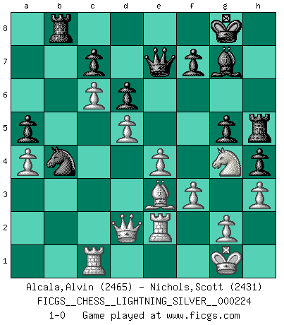 Last move : 1-0 2012 August 8 19:34:41 [Event "FICGS__CHESS__LIGHTNING_SILVER__000224"] [Site "FICGS"] [Date "2012.08.08"] [Round "1"] [White "Alcala,Alvin"] [Black "Nichols,Scott"] [Result "1-0"] [WhiteElo "2465"] [BlackElo "2431"] 1.e4 d6 2.d4 Nf6 3.f3 h5 4.Nc3 g6 5.Be3 Bg7 6.Bc4 e6 7.Nge2 h4 8.h3 a6 9.a4 Nh5 10.O-O Nc6 11.Qd2 Bf6 12.Nd1 Bd7 13.Nf2 Ng3 14.Rfe1 Bg7 15.b4 e5 16.c3 Kf8 17.Bd5 exd4 18.cxd4 Kg8 19.Nf4 g5 20.Ne2 Nxe2+ 21.Rxe2 Rh5 22.Rc1 Be8 23.Ng4 a5 24.b5 Nb4 25.Bxb7 Rb8 26.Bc6 Bxc6 27.bxc6 Qe7 28.d5 1-0 King's pawn Opening Kingside Castling by player White (move 10) Player White won this chess game. Follow this game move after move (download)It is not enough to be a good player... you must also play well. (Siegbert Tarrasch) Über die Verhaftung Bobby Fischers: Warum es die Bush-Administration für nötig befindet einen 61 Jahre alten Mann zu hetzten, der für niemanden ausser sich selbste eine Gefahr darstellt ist ein Rätsel. (Nigel Short) Cada Peón es una Reina en potencia. (James Mason) Il vaut toujours mieux jouer un plan faux de façon logique que de n'avoir pas de plan du tout. (Victor Kortchnoï) An expert is a man who has made all the mistakes which can be made in a very narrow field. (Niels Bohr)