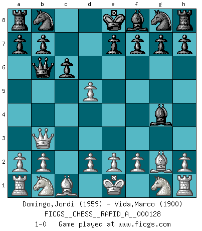 Last move : 1-0 2012 September 29 9:6:0 [Event "FICGS__CHESS__RAPID_A__000128"] [Site "FICGS"] [Date "2012.08.10"] [Round "1"] [White "Domingo,Jordi"] [Black "Vida,Marco"] [Result "1-0"] [WhiteElo "1959"] [BlackElo "1900"] 1.g4 d5 2.Bg2 Bxg4 3.c4 c6 4.Qb3 Qb6 5.cxd5 1-0 This chess game has been lost on time (started : 2012.08.10 0:41:38) Grob : Fritz gambit Player White won this chess game. Follow this game move after move (download)Chess is like life. (Boris Spassky) Das Zentrum ist der Balkan des Schachbretts - Kriegshandlungen können in jedem Moment ausbrechen. (Aaron Nimzowitsch) El Ajedrez es un expediente tonto que hace creer a la gente inactiva que hacen una cosa muy astuta cuando solamente estan perdiendo su tiempo. (George Bernard Shaw) A chaque perte on perd un peu de soi. (Joël Lautier) Treat your password like your toothbrush. Don't let anybody else use it, and get a new one every six months. (Clifford Stoll)