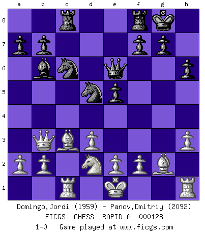 Last move : 1-0 2012 November 13 22:39:3 [Event "FICGS__CHESS__RAPID_A__000128"] [Site "FICGS"] [Date "2012.08.10"] [Round "1"] [White "Domingo,Jordi"] [Black "Panov,Dmitriy"] [Result "1-0"] [WhiteElo "1959"] [BlackElo "2092"] 1.g4 d5 2.Bg2 Bxg4 3.c4 c6 4.cxd5 Nf6 5.Nc3 cxd5 6.Qb3 Qd7 7.Nxd5 Nc6 8.Ne3 Rc8 9.Nxg4 Nxg4 10.Nf3 e5 11.h3 Nf6 12.Qa4 Bc5 13.d3 O-O 14.Bd2 h6 15.Rc1 Bb6 16.Bc3 Qe6 17.Nd2 Nd5 18.Qb3 1-0 This chess game has been lost on time (started : 2012.08.10 0:41:38) Grob : Fritz gambit Kingside Castling by player Black (move 13) Player White won this chess game. Follow this game move after move (download)It is difficult to play against Einstein's theory --on his first loss to Fischer. (Mikhail Tal) Garry Kasparov war erst in der Großmeister-Organisation GMA, dann in der Profischach-Vereinigung PCA, zum Schluss kehrte er wieder in den Schoß der FIDE zurück. Aber gut, manche Leute sind flexibel (Viswanathan Anand) Muchos jugadores de Ajedrez se sorprendían cuando después de la partida, Fischer explicaba con calma: 'Yo ya había analizado esta posibilidad' en una posición en la cual yo creía que no era posible de prever desde la apertura. (Mikhail Tal) Ce n'est pas pour s'amuser qu'il joue aux échecs : il célèbre un culte. (Vladimir Nabokov) Wisdom doesn't necessarily come with age. Sometimes age just shows up all by itself. (Tom Watson)