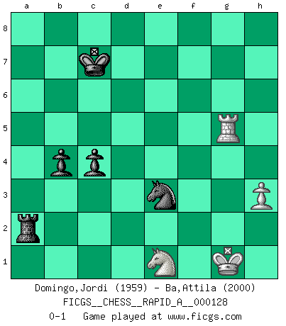 Last move : 0-1 2012 December 21 18:33:20 [Event "FICGS__CHESS__RAPID_A__000128"] [Site "FICGS"] [Date "2012.08.10"] [Round "1"] [White "Domingo,Jordi"] [Black "Ba,Attila"] [Result "0-1"] [WhiteElo "1959"] [BlackElo "2000"] 1.g4 d5 2.Bg2 e5 3.c4 dxc4 4.Qa4+ c6 5.Qxc4 Nf6 6.Nf3 Be6 7.Qc2 Na6 8.Nc3 Nb4 9.Qa4 Nxg4 10.h3 Nf6 11.a3 Na6 12.Nxe5 Nc5 13.Qf4 Nb3 14.Rb1 Bd6 15.d4 Qc7 16.Be3 O-O-O 17.O-O Kb8 18.Qg3 h6 19.f4 g5 20.fxg5 Nh5 21.Qf2 hxg5 22.Ne4 f6 23.d5 Bxd5 24.Nxd6 Rxd6 25.Nd3 Bxg2 26.Qxg2 c5 27.Qh2 b6 28.Rf3 Re8 29.Re1 a5 30.Nc1 Nd2 31.Bxd2 Rxd2 32.Qxc7+ Kxc7 33.b3 Re4 34.Rd3 Rc2 35.Red1 Re7 36.Kf2 Nf4 37.Rf3 Rh7 38.Rh1 a4 39.bxa4 Rh4 40.Re3 Nd5 41.Rd3 Nc3 42.Rf3 Rxa4 43.Kg2 Rxa3 44.Re1 b5 45.Rxf6 Nd5 46.Rf3 Ra1 47.Nd3 Rxe1 48.Nxe1 Rxe2+ 49.Kf1 Ra2 50.Rg3 b4 51.Rxg5 Ne3+ 52.Kg1 c4 0-1 Grob's attack Queenside Castling by player Black (move 16) Kingside Castling by player White (move 17) 10 pieces endgame at move 48 : White KRNP , Black KRNPPP WHITE : King + 1 Rook 1 Knight 1 Pawn BLACK : King + 1 Rook 1 Knight 3 Pawns 9 pieces endgame at move 51 : White KRNP , Black KRNPP WHITE : King + 1 Rook 1 Knight 1 Pawn BLACK : King + 1 Rook 1 Knight 2 Pawns Player Black won this chess game. Follow this game move after move (download)I had a toothache during the first game. In the second game I had a headache. In the third game it was an attack of rheumatism. In the fourth game, I wasn't feeling well. And in the fifth game? Well, must one have to win every game ? (Siegbert Tarrasch) Über Kasparov: Es ist offensichtlich, daß er in einem totalitären Staat aufwuchs und deshalb zu diktatorischen Zügen neigt. (Viktor Kortschnoi) La pasion por jugar al Ajedrez es una de las mas inexplicables en el mundo. (H.G. Wells) Si le désir cupide (et stupide) de gagner est une inépuisable source de souffrance, une combinaison brillante sur l'échiquier est une découverte : le coquelicot qui s'épanouit lorsque apparaît la Voie Lactée. (Arrabal) Employ the attack like tactic of defense. (Chinese proverb)