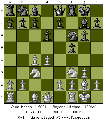 Last move : 0-1 2012 September 16 19:24:6 [Event "FICGS__CHESS__RAPID_A__000128"] [Site "FICGS"] [Date "2012.08.10"] [Round "1"] [White "Vida,Marco"] [Black "Rogers,Michael"] [Result "0-1"] [WhiteElo "1900"] [BlackElo "2064"] 1.d4 f5 2.g3 Nf6 3.Nf3 g6 4.Bg2 Bg7 5.c4 O-O 6.O-O d6 7.Nc3 Qe8 0-1 This chess game has been lost on time (started : 2012.08.10 0:41:38) Dutch defense Kingside Castling by player Black (move 5) Kingside Castling by player White (move 6) Player Black won this chess game. Follow this game move after move (download)You cannot play at Chess if you are kind-hearted. (French Proverb) Darum geht es im Schach. Einen Tag gibst du deinem Gegner eine Lektion, am nächsten Tag gibt er dir eine. (Robert James Fischer) En el tablero, la mentira e hipocresía no sobreviven mucho. (Emanuel Lasker) Que feriez-vous si vous étiez en train de jouer aux échecs et que la fin du monde arrive ? Je continuerais à jouer. (Saint Borromée) Coffee just isn't my cup of tea. (Unknown)