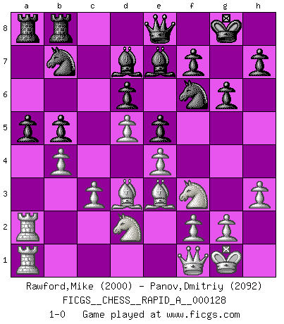 Last move : 1-0 2012 November 8 10:24:4 [Event "FICGS__CHESS__RAPID_A__000128"] [Site "FICGS"] [Date "2012.08.10"] [Round "1"] [White "Rawford,Mike"] [Black "Panov,Dmitriy"] [Result "1-0"] [WhiteElo "2000"] [BlackElo "2092"] 1.e4 e5 2.Nf3 Nc6 3.Bb5 a6 4.Ba4 Nf6 5.O-O Be7 6.Re1 b5 7.Bb3 d6 8.c3 O-O 9.h3 Na5 10.Bc2 c5 11.d4 Qc7 12.d5 c4 13.b4 cxb3 14.axb3 g6 15.Bh6 Rd8 16.Bd3 Bd7 17.Re2 Nb7 18.b4 Rdb8 19.Be3 Qc8 20.Rea2 a5 21.Qf1 Qe8 22.Nbd2 1-0 This chess game has been lost on time (started : 2012.08.10 0:41:38) Ruy Lopez : Closed Kingside Castling by player White (move 5) Kingside Castling by player Black (move 8) Player White won this chess game. Follow this game move after move (download)We must make sure that Chess will not be like a dead language, very interesting, but for a very small group. (Sytze Faber) Wie ich sie so einen nach dem anderen nieder mähte wurde meine Überlegenheit offensichtlich. (José Raúl Capablanca) Cuando le juegas a Fischer, no es una cuestion de si vas a ganar o perder. Es una cuestion de si vas a sobrevivir. (Boris Spassky) Des points faibles ou des trous dans la position de l'adversaire doivent être occupés par des pièces et non pas par des pions. (Siegbert Tarrasch) They say in chess you've got to kill the queen, and then you mate it... Oh I, do you ? (Red Hot Chili Peppers, Fortune faded)