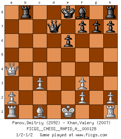 Last move : 1/2-1/2 2012 September 23 12:30:37 [Event "FICGS__CHESS__RAPID_A__000128"] [Site "FICGS"] [Date "2012.08.10"] [Round "1"] [White "Panov,Dmitriy"] [Black "Khan,Valery"] [Result "1/2-1/2"] [WhiteElo "2092"] [BlackElo "2007"] 1.e4 c6 2.d4 d5 3.exd5 cxd5 4.c4 Nf6 5.Nc3 Nc6 6.Nf3 Bg4 7.cxd5 Nxd5 8.Qb3 Bxf3 9.gxf3 e6 10.Qxb7 Nxd4 11.Bb5+ Nxb5 12.Qc6+ Ke7 13.Qxb5 Nxc3 14.bxc3 Rb8 15.Qc5+ Ke8 16.Qxa7 Qc8 17.Qa4+ Qd7 1/2-1/2 Caro-Kann : Panov-Botvinnik attack This chess game ended in a draw. Follow this game move after move (download)Via the squares on the chessboard, the Indians explain the movement of time and the age, the higher influences which control the world and the ties which link Chess with the human soul. (Al-Masudi) Es ist besser die Steine des Gegners zu opfern. (Savielly Grigorievitsch Tartakower) Aún el Rey más flojo huye despavorido ante la amenaza de un Jaque doble. (Aaron Nimzowitsch) Les Echecs représentent une sphère d'idées créatrices basée sur la volonté des deux protagonistes. (Smyslov) Hold em is to stud what chess is to checkers. (Johnny Moss)