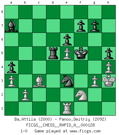 Last move : 1-0 2012 October 27 10:40:36 [Event "FICGS__CHESS__RAPID_A__000128"] [Site "FICGS"] [Date "2012.08.10"] [Round "1"] [White "Ba,Attila"] [Black "Panov,Dmitriy"] [Result "1-0"] [WhiteElo "2000"] [BlackElo "2092"] 1.f4 d5 2.Nf3 Nf6 3.c4 e6 4.e3 Be7 5.Bd3 Nc6 6.a3 d4 7.O-O a5 8.Kh1 O-O 9.exd4 Nxd4 10.Nc3 b6 11.Be2 Bb7 12.d3 Nf5 13.Ne5 c6 14.Na4 b5 15.Nc3 Nd7 16.Bf3 Nxe5 17.fxe5 bxc4 18.dxc4 Ba6 19.Bxc6 Bxc4 20.Bxa8 Bxf1 21.Be4 Qxd1 22.Nxd1 Rd8 23.Nc3 Bd3 24.Bd2 h6 25.Bxd3 Rxd3 26.Ne4 Rd5 27.Bc3 Ne3 28.Nd2 a4 29.Re1 Rd3 30.Rc1 Kh7 31.g3 Kg6 32.Ne4 Kf5 33.Nf2 Rd5 34.Re1 Bc5 35.h3 h5 36.h4 Rd7 37.Kh2 Rd8 38.Kh3 Rd7 39.Re2 Rd5 40.Re1 Bb6 41.Re2 Ba7 42.Re1 1-0 This chess game has been lost on time (started : 2012.08.10 0:41:38) Bird's Opening Kingside Castling by player White (move 7) Kingside Castling by player Black (move 8) Player White won this chess game. Follow this game move after move (download)Chess is above all, a fight ! (Emanuel Lasker) Man kann eine Schachpartie nur gewinnen, wenn das Gleichgewicht gestört ist. In einer Stellung mit ungestörtem Gleichgewicht ist auch das größte Genie hilflos - in der Stellung steckt dann eben kein genialer Einfall. (Wilhelm Steinitz) Yo siempre he tenido un ligero sentimiento de lástima por una persona que no tiene conocimiento del Ajedrez. (Siegbert Tarrasch) Même un GMI sait rarement calculer sur plus de cinq coups une attaque à sacrifices. (Rudolf Spielmann) Patience, use the Force, think ! (Obi-Wan Kenobi in Star Wars ep.2)