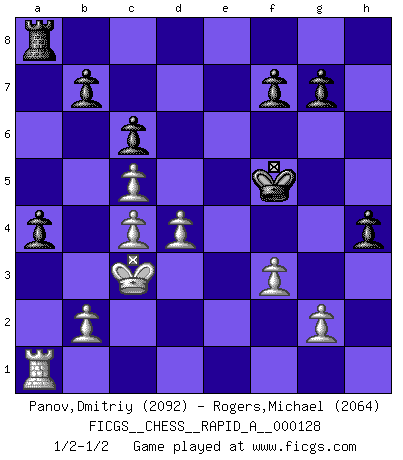 Last move : 1/2-1/2 2012 October 14 7:10:7 [Event "FICGS__CHESS__RAPID_A__000128"] [Site "FICGS"] [Date "2012.08.10"] [Round "1"] [White "Panov,Dmitriy"] [Black "Rogers,Michael"] [Result "1/2-1/2"] [WhiteElo "2092"] [BlackElo "2064"] 1.e4 e5 2.Nf3 Nc6 3.Nc3 Nf6 4.Bb5 Nd4 5.Ba4 Bc5 6.Nxe5 O-O 7.Nd3 Bb6 8.e5 c6 9.O-O Ne8 10.Ne2 Qh4 11.Ng3 d6 12.c3 Nf5 13.Ne1 Nxg3 14.hxg3 Qxg3 15.d4 Qg4 16.Nd3 Qxd1 17.Rxd1 dxe5 18.Nxe5 Nf6 19.Bf4 Be6 20.Bb3 Bxb3 21.axb3 Bc7 22.Nd3 Bxf4 23.Nxf4 a6 24.f3 Rfe8 25.Kf2 Re7 26.Re1 Rxe1 27.Rxe1 Kf8 28.Nd3 Nd7 29.b4 a5 30.Ra1 a4 31.Nc5 Nxc5 32.bxc5 Ke7 33.Ke3 h5 34.Kd3 Ke6 35.c4 h4 36.Kc3 Kf5 1/2-1/2 Four knights : Rubinstein counter-gambit Kingside Castling by player Black (move 6) Kingside Castling by player White (move 9) This chess game ended in a draw. Follow this game move after move (download)In blitz, the Knight is stronger than the Bishop. (Vlastimil Hort) Das Spiel gibt uns die Genugtuung, die das Leben uns versagt. (Emanuel Lasker) Ciertamente, de todas la drogas del mundo, el Ajedrez debe ser el mas placentero permamentemente. (Assiac) Psychologiquement, tu dois avoir confiance en toi même, mais cette confiance doit être basée sur des faits. (Robert Fischer) Kids, you tried your best and you failed miserably. The lesson is, never try. (Simpsons)
