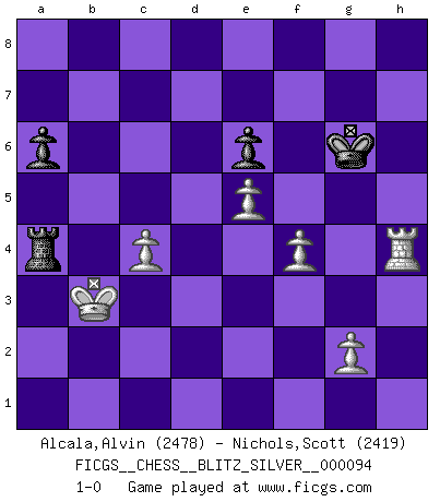 Last move : 1-0 2012 August 11 19:1:19 [Event "FICGS__CHESS__BLITZ_SILVER__000094"] [Site "FICGS"] [Date "2012.08.11"] [Round "1"] [White "Alcala,Alvin"] [Black "Nichols,Scott"] [Result "1-0"] [WhiteElo "2478"] [BlackElo "2419"] 1.e4 c6 2.Nf3 d5 3.Nc3 Nf6 4.e5 Ne4 5.Be2 Nxc3 6.dxc3 Bg4 7.O-O e6 8.a4 Be7 9.h3 Bh5 10.Bf4 O-O 11.Nd4 Bg6 12.Bd3 c5 13.Nf3 Nc6 14.Bxg6 fxg6 15.Bh2 Rf5 16.Qd3 Qb6 17.b3 Raf8 18.Rad1 g5 19.Bg3 h5 20.c4 Nb4 21.Qe2 d4 22.Ne1 Na2 23.Qxh5 Nc3 24.Qg4 Nxd1 25.Qxd1 Qc6 26.Qd2 Rc8 27.Nd3 b6 28.f3 a6 29.Ra1 b5 30.Nb2 Rd8 31.Qd3 b4 32.Re1 Rdf8 33.Qd1 Kf7 34.Nd3 Bd8 35.Re4 Bc7 36.Qd2 Rh8 37.Rg4 Rh5 38.Qe2 Ke7 39.Nf2 Kd7 40.Kf1 Ke7 41.Ke1 g6 42.Kd2 Kf8 43.Kd3 Ke7 44.Qe1 Ke8 45.Ne4 Bd8 46.Nd6+ Ke7 47.Kd2 Kf8 48.Re4 Kg7 49.Nxf5+ gxf5 50.Re2 Qe8 51.Kc1 f4 52.Bf2 Qg6 53.Bxd4 cxd4 54.Qxb4 Qf7 55.Re4 Rh8 56.Rxd4 Be7 57.Qb6 Rc8 58.b4 Qf5 59.Re4 Qf8 60.c5 Bxc5 61.bxc5 Qxc5 62.Qxc5 Rxc5 63.c4 Ra5 64.Kb2 Rxa4 65.h4 gxh4 66.Rxf4 Ra5 67.Rg4+ Kh7 68.f4 Ra4 69.Rxh4+ Kg6 70.Kb3 1-0 Caro-Kann defense Kingside Castling by player White (move 7) Kingside Castling by player Black (move 10) 10 pieces endgame at move 69 : White KRPPPP , Black KRPP WHITE : King + 1 Rook 4 Pawns BLACK : King + 1 Rook 2 Pawns Player White won this chess game. Follow this game move after move (download)The combination player thinks forward; he starts from the given position, and tries the forceful moves in his mind. (Emanuel Lasker) Mit Schach schule ich mein Gefühl für Geometrie, was für Tennis und Schach gleichermaßen wichtig ist. (Boris Becker) El Ajedrez es una hermosa aventura. (Bent Larsen) L'attaque fait le spectacle, la défense gagne les matchs. (Dicton footballistique) Men never do evil so completely and cheerfully as when they do it from religious conviction. (Blaise Pascal)