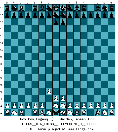 Last move : 1-0 2012 September 11 6:19:34 [Event "FICGS__BIG_CHESS__TOURNAMENT_B__000005"] [Site "FICGS"] [Date "2012.08.11"] [Round "1"] [White "Novikov,Evgeny"] [Black "Walden,Janeen"] [Result "1-0"] [WhiteElo ""] [BlackElo "2018"] 1.g2-g4 1-0 This big chess game has been lost on time (started : 2012.08.11 22:57:48) Follow this game move after move (download)Chess is a terrific way for kids to build self image and self esteem. (Saudin Robovic) Pläne sind die Träume des Verständigen. (Ernst Freiherr von Feuchtersleben) Todavía soy una víctima del Ajedrez. Tiene toda la belleza del arte y mucho mas. No puede ser comercializado. El Ajedrez es mas puro que el arte en su posición social. (Marcel Duchamp) Les échecs c'est le défi de l'alpiniste, toujours plus haut, prêt à tout pour monter à l'assaut du Roi ennemi. Les échecs, c'est de la musique en mouvement, un ballet majestueux pour les yeux. C'est de la poésie composée par les fantômes du passé qui au même titre que Rimbaud ou Verlaine méritent notre admiration. Les échecs, c'est de la peinture ou le moindre mouvement modifie le tableau pour en faire un Picasso ou un Van Gogh. Les échecs, c'est tout et rien, c'est la vie et la mort. Jjulie33 sur le forum de France-Echecs. Internal peace cannot coexist with external war. (Don Groves)