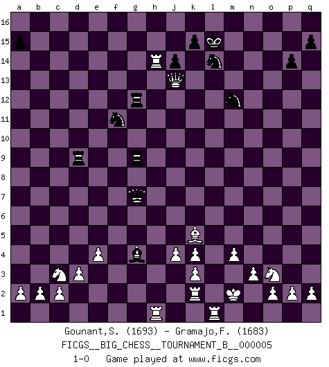 Last move : 1-0 2012 November 27 11:13:19 [Event "FICGS__BIG_CHESS__TOURNAMENT_B__000005"] [Site "FICGS"] [Date "2012.08.11"] [Round "1"] [White "Gounant,Stanislas"] [Black "Gramajo,Francisco"] [Result "1-0"] [WhiteElo "1693"] [BlackElo "1683"] 1.j2-k4 j15-k13 2.h1-o7 p16-o14 3.o7-f15 g16-f14 4.f15-a10 d15-d13 5.p1-o3 n15-n13 6.m2-m4 m15-m13 7.l1-o4 e15-e13 8.n2-n3 l16-o13 9.e2-e4 c16-k9 10.b1-c3 o16-f8 11.h2-j4 f8-k4 12.j3-k4 h16-l13 13.k1-l3 b16-c14 14.f1-c4 k9-g6 15.d2-d3 g6-j4 16.h3-j4 l13-d6 17.g2-g3 m16-m14 18.c1-f4 d6-k6 19.g1-h3 f16-b12 20.o1-k5 m14-l14 21.f4-k8 f14-g12 22.a10-d13 a16-d16 23.d13-b13 o14-n12 24.c4-m13 l14-m14 25.m13-o15 b12-h6 26.k8-h6 k6-h6 27.e1-h1 n12-l11 28.b13-b15 c14-d12 29.b15-c15 p15-p14 30.c15-g15 l11-m13 31.k5-g8 l15-l14 32.g15-g12 q16-o16 33.o15-m13 l14-m13 34.k2-k3 e16-g16 35.g12-l8 m14-l14 36.l8-n8 l14-l3 37.n8-n13 k16-l14 38.n13-m13 h15-k14 39.m13-k11 l3-l2 40.g8-d11 j16-j15 41.o4-e13 h6-n6 42.k11-f15 k14-h15 43.f15-h15 j15-k14 44.e13-g11 g16-g11 45.m1-k1 n6-b6 46.a1-b1 l2-f2 47.h3-f2 b6-f2 48.k1-k2 f2-g3 49.h1-h2 o16-g16 50.b1-h1 o13-p12 51.j1-k1 p12-g4 52.k1-l2 g3-l7 53.l2-m2 g16-g15 54.h15-e12 g15-g12 55.e12-e9 d12-f11 56.e9-p9 k13-m12 57.q1-l1 l7-d7 58.d11-k5 d7-g7 59.h2-h14 g11-g9 60.p9-l5 d16-d9 61.l5-l13 k14-l15 62.l13-n15 l15-k14 63.n15-l13 k14-l15 64.l13-j13 1-0 This big chess game has been lost on time (started : 2012.08.11 22:57:48) Follow this game move after move (download)Chess is a forcing house where the fruits of character can ripen more fully than in life. (Edward Morgan Foster) Deine Wertungszahl - vorausgesetzt einige Jahre schachliche Anstrengung - entspricht etwa dem zehnfachen Deines IQ plus 1000. (Jonathan Levitt) Siempre es mucho mejor sacrificar las piezas de tu oponente. (Savielly Tartakover) Il n'y a pas de prix trop élevé au scalp de l'ennemi. (Koblentz) I take risks, sometimes patients die, but not taking risks causes more patients to die. So I guess my biggest problem is I've been cursed with the ability to do the math. (Gregory House, House M.D.)