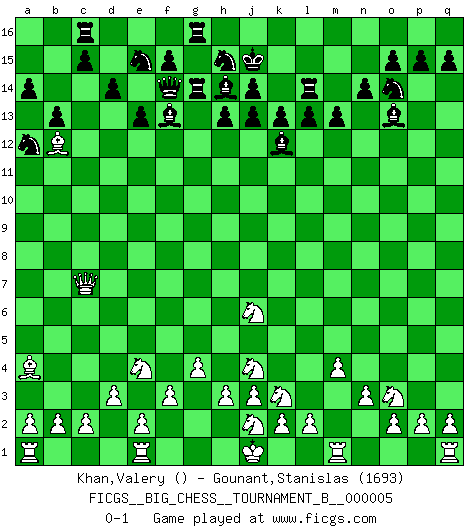 Last move : 0-1 2012 October 20 22:10:11 [Event "FICGS__BIG_CHESS__TOURNAMENT_B__000005"] [Site "FICGS"] [Date "2012.08.11"] [Round "1"] [White "Khan,Valery"] [Black "Gounant,Stanislas"] [Result "0-1"] [WhiteElo ""] [BlackElo "1693"] 1.g2-g4 j15-h13 2.h1-a8 m15-m13 3.n2-n3 l16-o13 4.d2-d3 n15-n14 5.p1-o3 g15-g14 6.f1-g2 o16-k12 7.c1-k8 e15-e13 8.o1-c12 h16-f14 9.g1-f3 d15-d14 10.b1-d2 c16-f13 11.a8-b8 b15-b14 12.m2-m4 p16-o14 13.l1-m2 b16-d15 14.c12-b13 g16-e15 15.k1-l3 m16-m14 16.l3-j4 a15-a14 17.b13-a12 l15-l13 18.b8-c7 b14-b13 19.a12-d9 d15-c13 20.k8-o12 m14-k14 21.m2-e9 h15-j13 22.o12-l15 k14-l14 23.l15-j13 h14-j13 24.f3-h4 k16-h15 25.g2-c6 k15-k13 26.f2-f3 f16-h14 27.d9-h13 g14-h13 28.d2-e4 j16-j15 29.c6-g10 a16-c16 30.h2-k3 e16-g16 31.g10-a4 g16-g14 32.e9-b12 c13-a12 33.h4-j6 q16-g16 0-1 This big chess game has been lost on time (started : 2012.08.11 22:57:48) Follow this game move after move (download)Modern Chess is too much concerned with things like Pawn structure. Forget it, Checkmate ends the game. (Nigel Short) Ein bischen Romantik kann weder im Schach noch in der Liebe schaden. Also versuche ich mich ab und zu daran zu erinnern. (Nigel Short) Los Peones son nacidos libres, y aún así, se encuentran encadenados por todos lados. (Rick Kennedy) Donnez-moi un Cavalier en 6e et je gagnerais toutes mes parties. (Steinitz) There is a very easy way to return from a casino with a small fortune : go there with a large one. (Jack Yelton)