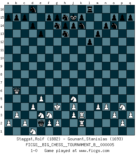 Last move : 1-0 2012 October 2 2:57:29 [Event "FICGS__BIG_CHESS__TOURNAMENT_B__000005"] [Site "FICGS"] [Date "2012.08.11"] [Round "1"] [White "Staggat,Rolf"] [Black "Gounant,Stanislas"] [Result "1-0"] [WhiteElo "1882"] [BlackElo "1693"] 1.j2-k4 p16-o14 2.h2-g4 j15-g14 3.d2-d4 m15-m13 4.e2-e4 l16-o13 5.m2-m4 n15-n14 6.n2-n4 e15-e13 7.p1-o3 f16-c13 8.g1-f3 d15-d14 9.b1-c3 c16-k9 10.c1-h6 o16-g9 11.f1-b5 h16-l13 12.l1-p5 k16-m15 13.o1-j6 b16-c14 14.m1-m3 m15-k14 15.m3-l3 l13-m14 16.k1-h2 g16-f14 17.h1-l4 l15-l13 18.b5-f9 k14-h13 19.f9-h7 k9-h7 20.j6-h7 o13-h7 21.l4-h7 l13-l12 22.p5-l9 m16-l16 23.l9-j7 g9-j7 24.h6-j7 c13-j7 25.h7-j7 l16-l13 26.q1-m1 l13-j13 27.j7-p13 q16-p16 28.o3-n5 j16-j15 29.p13-p9 h15-k14 30.m1-m3 e16-l16 31.j1-j2 l16-l13 32.k4-l6 a16-l16 33.e1-e3 l13-k13 34.a1-n1 l16-l13 35.n1-n3 k13-k12 36.h2-j4 l13-k13 37.p9-b9 j13-j4 38.h3-j4 k12-k2 39.j2-h3 m14-h10 40.f3-h4 h10-d6 41.e3-d3 h13-f12 42.l3-k3 k13-k3 43.m3-k3 k2-l2 44.b9-k9 f14-h15 45.k3-k2 l2-l1 46.e4-e5 d6-b6 47.b2-b3 l1-h1 48.k2-h2 h1-c1 49.c3-a4 b6-b5 50.g4-e3 g14-f16 51.a4-c3 b5-a6 52.n3-k3 f16-g14 53.k3-k6 a6-a10 54.k9-f5 a10-q10 55.q2-q3 q10-q4 56.f5-m5 q4-o4 57.d3-d1 c1-d1 58.c3-d1 o4-l1 59.h2-k2 l1-p1 60.o2-o3 p1-n3 61.m5-n6 n3-p1 62.n5-p4 p1-e1 63.n6-n11 e1-h1 64.h3-g4 f12-h13 65.k6-k3 h1-e1 66.n11-b11 e1-e2 67.h4-f3 c14-d16 68.b11-b6 p16-l16 69.l6-j5 1-0 Follow this game move after move (download)When you play Bobby, it is not a question if you win or lose. It is a question if you survive. (Boris Spassky) Versuche, dich von der Sklaverei der Eröffnungsvarianten zu befreien. Stattdessen soll man gewisse Typenpositionen erlernen, die man eingehend analysiert. (Aaron Nimzowitsch) El jugador táctico debe saber que hacer cuando algo se debe de hacer. El estratégico debe saber que hacer cuando nada se debe de hacer. (Savielly Tartakover) Il (Jacob Murray) ne joue pas pour le bon coup, mais pour le meilleur. (Eloi Relange) I don't know, I don't care, and it doesn't make any difference. (Albert Einstein)