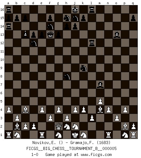 Last move : 1-0 2012 November 13 22:39:3 [Event "FICGS__BIG_CHESS__TOURNAMENT_B__000005"] [Site "FICGS"] [Date "2012.08.11"] [Round "1"] [White "Novikov,Evgeny"] [Black "Gramajo,Francisco"] [Result "1-0"] [WhiteElo ""] [BlackElo "1683"] 1.g2-g4 g15-g13 2.b2-b3 h16-f14 3.f2-f3 n15-n13 4.c1-b2 m15-m13 5.b2-n13 e15-e13 6.n13-l15 m16-m15 7.l15-a5 d15-d13 8.k2-k4 c16-o5 9.m2-m3 f16-c13 10.n2-n4 o5-n6 11.p2-p3 f14-f13 12.m3-m4 o16-g9 13.l2-l3 m15-n15 14.o2-o3 l16-o13 15.l1-n3 p16-o14 16.m1-n1 b16-c14 17.e2-e4 q16-l16 18.p3-p4 c14-d12 19.m4-m5 n6-m7 20.o1-p2 o14-n12 21.n3-g9 n15-n14 22.g9-h8 n12-l11 23.f1-c4 l11-k9 24.h8-m4 e16-e14 25.c4-m13 n14-n13 26.m13-o15 e14-a14 27.a5-c3 n13-l13 28.o15-c4 k16-l14 29.c3-p15 l14-k12 30.a2-a4 k12-j10 31.p15-m12 l13-l12 32.m12-b2 g16-f14 33.j3-j4 j10-h8 34.h1-g2 1-0 This big chess game has been lost on time (started : 2012.08.11 22:57:48) Follow this game move after move (download)All my games are real. (Bobby Fischer) Darum geht es im Schach. Einen Tag gibst du deinem Gegner eine Lektion, am nächsten Tag gibt er dir eine. (Robert James Fischer) Con o sin el título, Bobby Fischer fue sin lugar a dudas el mas grande jugador de su época. (Burt Hochberg) Nous sommes les pions de la mystérieuse partie d'Echecs jouée par Dieu. Il nous déplace, nous arrête, nous pousse encore, puis nous lance un à un dans la boîte du Néant. Epitaphe sur la tombe de David Janowsky (1868-1927). A computer lets you make more mistakes faster than any invention in human history - with the possible exceptions of handguns and tequila. (Mitch Ratcliffe)