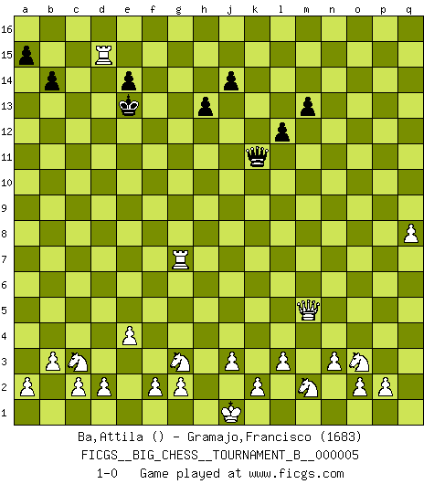 Last move : 1-0 2012 October 9 8:50:58 [Event "FICGS__BIG_CHESS__TOURNAMENT_B__000005"] [Site "FICGS"] [Date "2012.08.11"] [Round "1"] [White "Ba,Attila"] [Black "Gramajo,Francisco"] [Result "1-0"] [WhiteElo ""] [BlackElo "1683"] 1.m2-m4 b15-b14 2.l1-o4 j15-h13 3.n2-n3 c16-b15 4.p1-o3 m15-m13 5.j2-k4 n15-n13 6.h1-n6 e15-e14 7.n6-n13 l15-l13 8.b2-b3 f16-b12 9.c1-b2 o16-f8 10.n13-p15 p16-n15 11.l2-l3 l16-o13 12.p15-o15 l13-l12 13.b2-q16 m16-q16 14.o4-j9 h16-p9 15.j9-q16 o13-j8 16.b1-c3 k16-l14 17.e2-e4 g16-j15 18.g1-j2 h15-k14 19.k1-m2 j16-h15 20.q16-d4 b16-c14 21.f1-e2 e16-o16 22.o15-q13 c14-e13 23.h2-j4 o16-o13 24.q13-q3 a16-o16 25.q3-p3 p9-g9 26.p3-e13 l14-j13 27.j1-h2 j15-g14 28.e13-c15 g9-a9 29.j4-g3 b15-c14 30.c15-p3 o16-p16 31.p3-n5 n15-l14 32.e2-j6 b12-c13 33.j6-h7 j8-h7 34.o1-h7 o13-o7 35.h7-q15 p16-o16 36.n5-f5 f8-h6 37.d4-e3 h6-g7 38.e3-f4 a9-d9 39.q15-g6 d9-p9 40.m1-p1 l14-k12 41.q2-q4 j13-h11 42.q4-q5 k12-j10 43.q5-q6 h11-g9 44.q6-q7 h13-g11 45.g6-l10 o7-o5 46.m4-m5 j10-k8 47.l10-q5 g9-h7 48.f5-f15 k14-h13 49.f15-f7 g11-h9 50.f4-e3 c13-h8 51.g3-e2 h13-g11 52.q1-q3 h9-f8 53.q3-p3 p9-q8 54.p1-q1 g11-h9 55.p3-p8 q8-q12 56.q5-g14 h15-g14 57.q1-q3 o16-o7 58.e1-q1 h7-j5 59.e3-k8 h9-k8 60.p8-k8 f8-h7 61.k8-k15 h7-g5 62.f7-g8 g14-h13 63.h3-h4 g5-j4 64.h2-j1 h8-l11 65.h4-j5 q12-j5 66.j2-g3 j4-g3 67.e2-g3 o7-o8 68.g8-e10 h13-g14 69.e10-g12 g14-f14 70.g12-g15 f14-f13 71.q7-q8 c14-m5 72.k4-m5 o5-m5 73.a1-h1 o8-h8 74.h1-h8 g7-h8 75.q3-q7 h14-h13 76.q7-f7 f13-e12 77.g15-g10 e12-e13 78.k15-d15 j5-c11 79.g10-m5 c11-k11 80.q1-q7 h8-g7 81.q7-g7 l11-g7 82.f7-g7 1-0 Follow this game move after move (download)There are two classes of men; those who are content to yield to circumstances and who play whist; those who aim to control circumstances, and who play Chess. (Mortimer Collins) Oft bringt ein stiller Zug das Erdbeben. (Richard Reti) Dios mío, Bobby Fischer juega tan simple. (Alexei Suetin) Soyez une menace à chaque fois que vous vous asseyez pour jouer. (Ken Smith) Life is like a play: it's not the length but the excellence of the acting that matters. (Seneca)