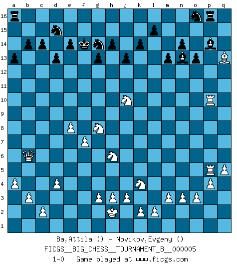 Last move : 1-0 2012 November 16 23:0:24 [Event "FICGS__BIG_CHESS__TOURNAMENT_B__000005"] [Site "FICGS"] [Date "2012.08.11"] [Round "1"] [White "Ba,Attila"] [Black "Novikov,Evgeny"] [Result "1-0"] [WhiteElo ""] [BlackElo ""] 1.e2-e4 g15-g13 2.f1-c4 n15-n14 3.p2-p3 m15-m13 4.o1-p2 c15-c14 5.j2-k4 h16-c11 6.d2-d3 d15-d13 7.h1-o7 c11-f11 8.p2-f11 p16-o14 9.o7-f15 e16-d16 10.f15-l10 j15-k13 11.m2-m3 d16-d14 12.g1-f3 m16-m14 13.l1-o4 d14-f14 14.f11-n4 m14-l14 15.l10-q5 c16-d15 16.c1-k8 b16-a14 17.k1-l3 d15-e16 18.q5-o3 e15-e14 19.b1-c3 o16-f8 20.l3-j2 f16-c13 21.n2-n3 h15-j13 22.p1-n2 e16-o7 23.n2-l3 o7-h13 24.h2-g4 k16-m15 25.a2-a3 g16-e15 26.k8-d14 c13-d14 27.o4-d14 e15-f13 28.d14-o4 b15-b14 29.e1-e2 k15-k14 30.j1-h2 j16-j15 31.f3-h4 a14-c13 32.g2-g3 l16-k15 33.f2-f4 m15-l13 34.o4-j9 j13-g12 35.j9-o14 p15-o14 36.o3-o14 a16-o16 37.e4-e5 l13-n12 38.o14-o3 j15-h15 39.e5-e6 f8-a13 40.m1-f1 o15-o13 41.e6-e7 l14-l11 42.f4-f5 o16-o14 43.f5-f6 o14-q14 44.f6-f7 q16-p16 45.e7-e8 p16-p12 46.c3-e4 h13-k11 47.q2-q3 l11-q11 48.q3-q4 q11-q10 49.f1-f6 g12-j13 50.a1-f1 q10-b10 51.b2-b3 a13-f8 52.a3-a4 f8-m14 53.f1-f5 p12-o12 54.f6-o6 b10-o10 55.f5-o5 o10-o6 56.o5-o6 o12-o6 57.o3-o6 q14-q12 58.o2-o3 k11-m9 59.e4-f6 q15-q13 60.n4-m5 m9-p12 61.e2-e5 q12-q11 62.e5-a5 f14-f15 63.q1-f1 m14-b4 64.a5-a9 b4-d6 65.a9-h9 d6-j11 66.o6-g6 k13-h12 67.f1-f5 q11-p11 68.p3-p4 p12-n10 69.q4-q5 n10-m11 70.m5-j8 m11-l12 71.h9-q9 l12-n10 72.h4-j6 p11-p14 73.j2-h4 k15-l14 74.l3-m5 n10-o11 75.q9-a9 p14-p16 76.m5-l7 a15-a14 77.l7-k9 j11-m14 78.f6-g8 f15-a15 79.h4-k5 l14-k13 80.k5-j7 h15-g14 81.g4-h6 n12-l13 82.k9-l11 k13-l14 83.j8-l10 g14-f14 84.l10-m9 o11-m9 85.l11-m9 l14-j12 86.m9-k10 j12-m15 87.j7-h9 m15-n16 88.a9-a5 n16-p14 89.f5-p5 l13-m15 90.g6-b6 c13-d15 91.h9-g11 m14-j11 92.p5-p10 m15-o16 93.k10-h9 j11-m14 94.a5-p5 f13-g11 95.h9-g11 j13-g14 96.d3-d4 a14-a13 97.j6-h8 a15-a16 98.c4-e2 m14-n13 99.h8-j10 h12-j10 100.g11-j10 j14-j13 101.e2-q13 1-0 Follow this game move after move (download)Bobby is the most misunderstood, misquoted celebrity walking the face of this earth. (Yasser Seirawan) Über Frauen: Chess is better. (Robert James Fischer) Los problemas de Ajedrez exigen del compositor las mismas virtudes que caracterizan todo el arte de valor: originalidad, invención, concisión, armonía, complejidad e insinceridad explendida. (Vladimir Nabokov) On est toujours la mazette de quelqu'un d'autre. (Anonyme) Everything in life is luck. (Donald Trump)