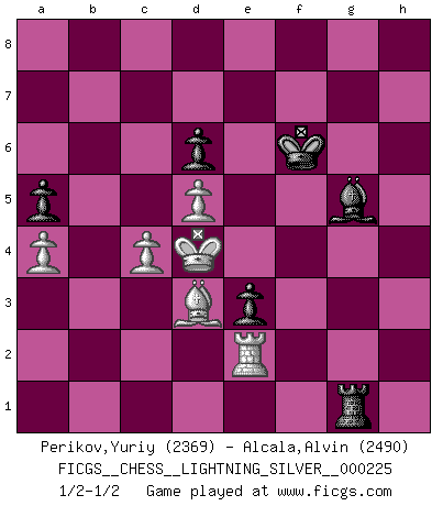Last move : 1/2-1/2 2012 August 12 18:15:25 [Event "FICGS__CHESS__LIGHTNING_SILVER__000225"] [Site "FICGS"] [Date "2012.08.12"] [Round "1"] [White "Perikov,Yuriy"] [Black "Alcala,Alvin"] [Result "1/2-1/2"] [WhiteElo "2369"] [BlackElo "2490"] 1.e4 c5 2.Nf3 d6 3.d4 cxd4 4.Nxd4 Nf6 5.Nc3 a6 6.Be3 e5 7.Nb3 Be6 8.f3 h5 9.Qd2 Nbd7 10.Nd5 Nxd5 11.exd5 Bf5 12.Be2 Qh4+ 13.Bf2 Qf6 14.O-O Be7 15.Bd3 O-O 16.c4 b6 17.Rae1 Rfe8 18.Bh4 Qxh4 19.Bxf5 Nc5 20.Nxc5 bxc5 21.Bd7 Reb8 22.Bc6 Ra7 23.b3 Bg5 24.Qc2 Qd4+ 25.Kh1 Qd2 26.Qxd2 Bxd2 27.Re2 Bc3 28.g4 hxg4 29.fxg4 f6 30.h4 Re7 31.Kg2 Rf8 32.h5 Kh7 33.Rf5 g6 34.hxg6+ Kxg6 35.Re3 Bd2 36.Rh3 e4 37.Kf1 Bg5 38.Ke2 e3 39.Rf1 f5 40.gxf5+ Rxf5 41.Rhf3 Rxf3 42.Kxf3 Rf7+ 43.Ke2 Re7 44.b4 cxb4 45.Ba4 Re5 46.Bc2+ Kg7 47.Rg1 Kf6 48.Rf1+ Ke7 49.Ra1 a5 50.a3 b3 51.Bxb3 Re4 52.Kd3 Rg4 53.Re1 Rg2 54.Re2 Rg1 55.Bc2 Kf6 56.Kd4 Ra1 57.a4 Rg1 58.Bd3 1/2-1/2 Sicilian : Najdorf, Byrne (English) attack Kingside Castling by player White (move 14) Kingside Castling by player Black (move 15) This chess game ended in a draw. Follow this game move after move (download)It is not enough to be a good player... you must also play well. (Siegbert Tarrasch) Es ist schade, dass viele Schachsportler vergessen, wie wichtig Auftreten und angemessene Kleidung sind. (Alexandra Kosteniuk) El Ajedrez es un regaderazo frío para la mente. (Sir John Simon) D'abord les bases : Jouez et étudiez, puis étudiez et jouez, ensuite jouez et étudiez, puis étudiez et jouez. Deuxièmement : Donnez toujours le meilleur de vous-même ! (Ken Smith) Optimism is a variety of information deficit. Sometimes especially true for correspondence chess games. (Michael Aigner)