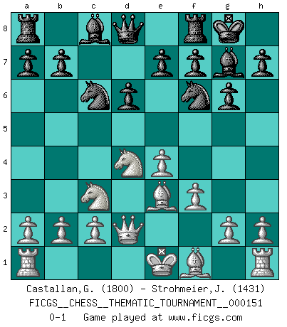 Last move : 0-1 2012 September 22 7:54:45 [Event "FICGS__CHESS__THEMATIC_TOURNAMENT__000151"] [Site "FICGS"] [Date "2012.08.12"] [Round "1"] [White "Castallan,Gerald"] [Black "Strohmeier,Josef"] [Result "0-1"] [WhiteElo "1800"] [BlackElo "1431"] 1.e4 c5 2.Nf3 d6 3.d4 cxd4 4.Nxd4 Nf6 5.Nc3 g6 6.Be3 Bg7 7.f3 O-O 8.Qd2 Nc6 0-1 This chess game has been lost on time (started : 2012.08.12 20:42:14) Sicilian : Dragon, Yugoslav attack, 7...O-O Kingside Castling by player Black (move 7) Player Black won this chess game. Follow this game move after move (download)When you don't know what to play, wait for an idea to come into your opponent's mind. You may be sure that idea will be wrong. (Siegbert Tarrasch) Du kannst im Schach nur gut werden, wenn du das Spiel liebst. (Robert James Fischer) Fischer era un maestro de claridad y un Rey del posicionamiento astuto. Sus oponentes podían ver hacia donde se dirigía pero eran impotentes para detenerlo. (Bruce Pandolfini) Le pion, dans sa simplicité, marche droit devant lui, mais lorsqu'il prend, il le fait obliquement? Ainsi l'homme, tant qu'il reste pauvre, marche dans la droiture et vit honnêtement, mais lorsqu'il recherche les honneurs, il flatte, se parjure et, par les voies obliques, cherche une position supérieure sur l'échiquier du monde. (Jean de Galles) Art disturbs, science reassures. (Georges Braque, Le Jour et la Nuit)