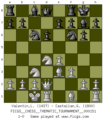 Last move : 1-0 2012 September 23 20:6:53 [Event "FICGS__CHESS__THEMATIC_TOURNAMENT__000151"] [Site "FICGS"] [Date "2012.08.12"] [Round "1"] [White "Valentin,Laurentiu"] [Black "Castallan,Gerald"] [Result "1-0"] [WhiteElo "1437"] [BlackElo "1800"] 1.e4 c5 2.Nf3 d6 3.d4 cxd4 4.Nxd4 Nf6 5.Nc3 g6 6.Be3 Bg7 7.f3 O-O 8.Qd2 Nc6 9.O-O-O 1-0 This chess game has been lost on time (started : 2012.08.12 20:42:14) Sicilian : Dragon, Yugoslav attack, 7...O-O Kingside Castling by player Black (move 7) Queenside Castling by player White (move 9) Player White won this chess game. Follow this game move after move (download)Winning isn't everything... but losing is nothing. (Mednis) Im Fernschach kannst du während dem Spiel rauchen. (John Christen Knudsen) Dios mío, Bobby Fischer juega tan simple. (Alexei Suetin) Je ne crois pas en la psychologie, je crois aux bons coups. (Robert Fischer) To be champion requires more than simply being a strong player; one has to be a strong human being as well. (Anatoly Karpov)