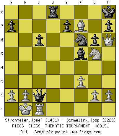 Last move : 0-1 2012 September 27 11:48:46 [Event "FICGS__CHESS__THEMATIC_TOURNAMENT__000151"] [Site "FICGS"] [Date "2012.08.12"] [Round "1"] [White "Strohmeier,Josef"] [Black "Simmelink,Joop"] [Result "0-1"] [WhiteElo "1431"] [BlackElo "2229"] 1.e4 c5 2.Nf3 d6 3.d4 cxd4 4.Nxd4 Nf6 5.Nc3 g6 6.Be3 Bg7 7.f3 O-O 8.Qd2 Nc6 9.O-O-O d5 10.exd5 Nxd5 11.Nxc6 bxc6 12.Ne4 Bf5 13.Bh6 Bxh6 14.Qxh6 Qb6 15.Rd3 Rfd8 16.Ng5 Nf6 17.Rxd8+ Rxd8 18.Bc4 Qe3+ 19.Kb1 Qd2 20.Bxf7+ Kh8 21.Rc1 Qxc2+ 0-1 Sicilian : Dragon, Yugoslav attack, 7...O-O Kingside Castling by player Black (move 7) Queenside Castling by player White (move 9) Player Black won this chess game. Follow this game move after move (download)When in doubt... play Chess ! (Tevis) Zum Sieg gelangt man nicht, wenn man gut, sondern nur wenn man besser spielt (Savielly Grigorievitsch Tartakower) Aquel que ve no otra dirección en el juego que la de dar Jaque Mate a su oponente, nunca será un buen jugador de Ajedrez. (Euwe) La vérité est comme le meilleur coup aux échecs : elle existe, mais il faut la chercher. (Arturo Perez-Reverte) Opportunities multiply as they are seized. (Sun Tzu)